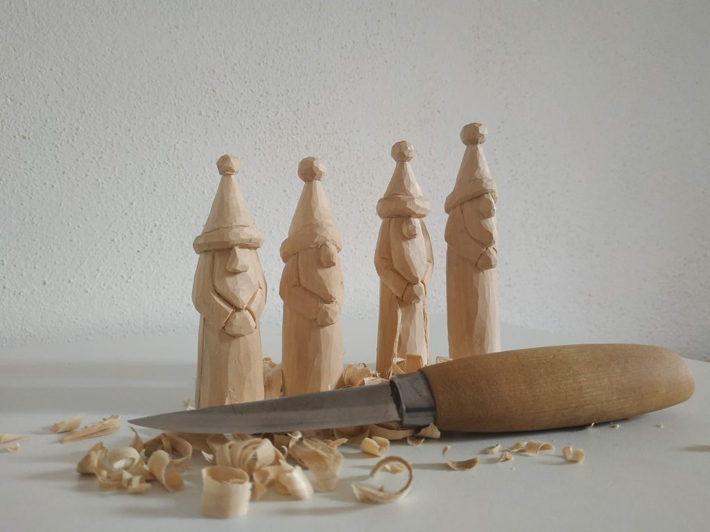 Kleine Nikolaus/Weihnachtsmann Figuren aus Linde geschnitzt unter Verwendung des Morakniv 120.