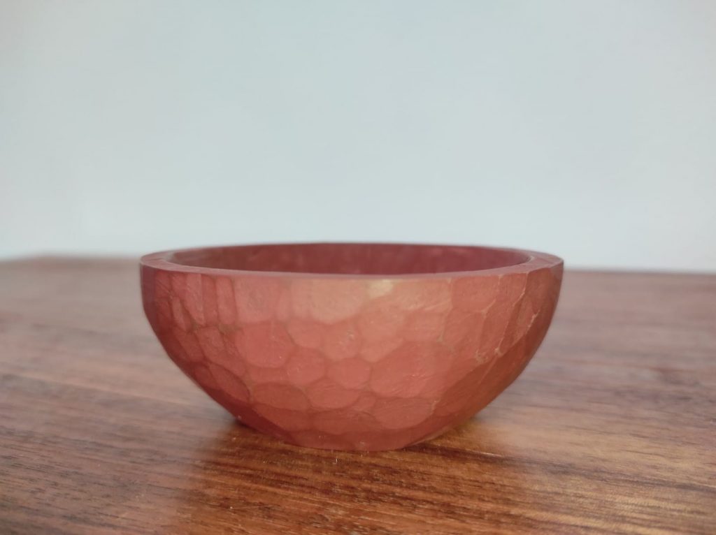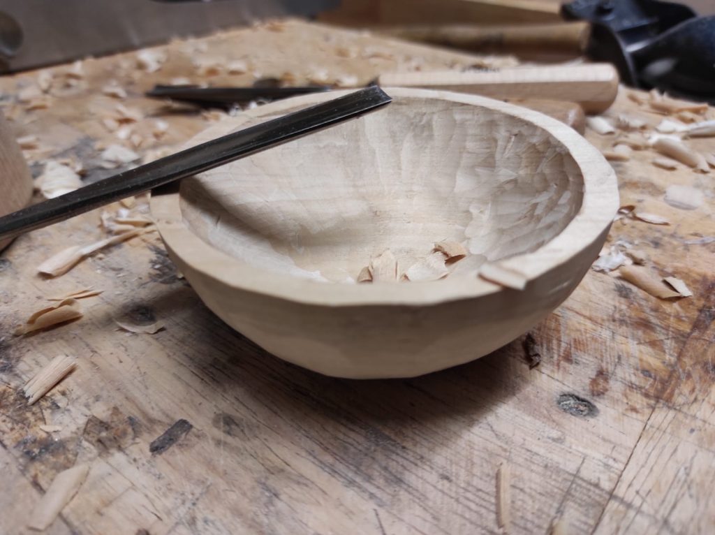 Zur Zeit versuche ich mich etwas am Schnitzen mit Schnitzeisen und da ich sowieso einen Schlüsselschale benötigte, habe ich zur Übung eine kleine Schale aus Lindenholz geschnitzt. Linde ist an sich kein besonders eindrucksvolles Holz, deshalb wurde die Schale danach mit Kaseinfarbe bemalt, die mit feiner Stahlwolle abgebürstet wurde, um die von den Schnitzeisen hinterlassenen Facetten etwas besser herauszuarbeiten.