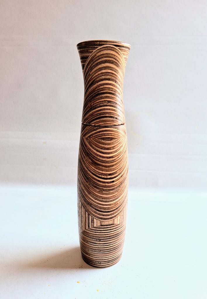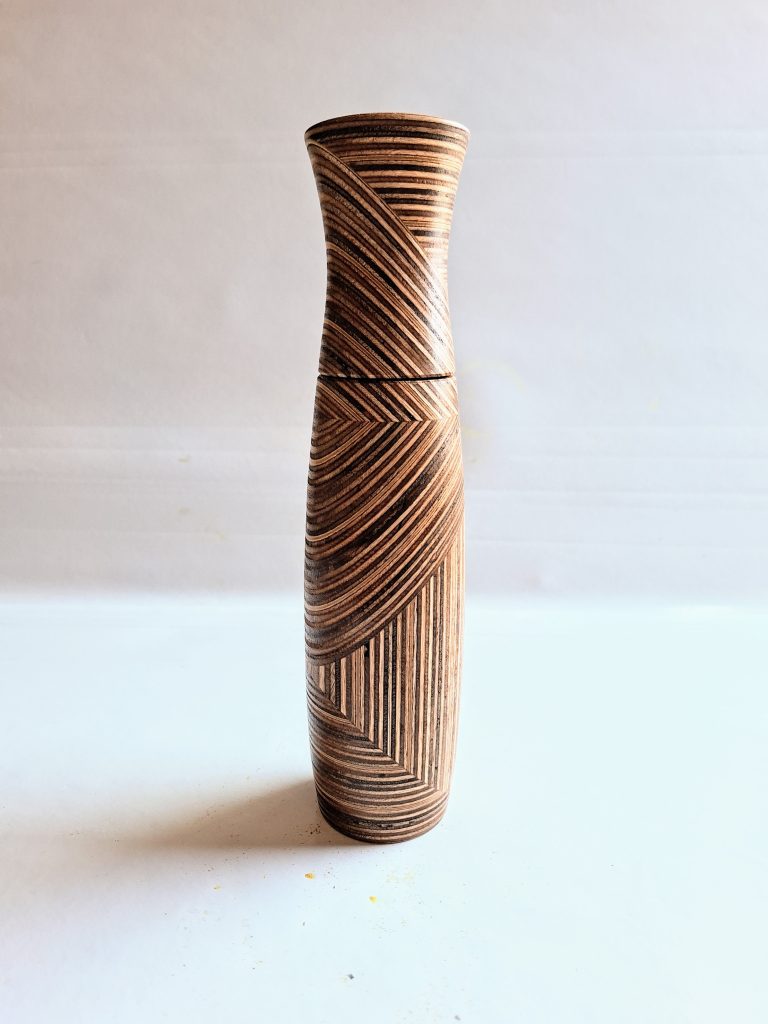 Pfeffermühle aus Multiplex, zugeschnitten Dreiecksklötzen. Geschliffen bis Körnung 400 und anschließend 3 x mit Tungöl von DICTUM eingelassen. Von 2 Seiten fotografiert.