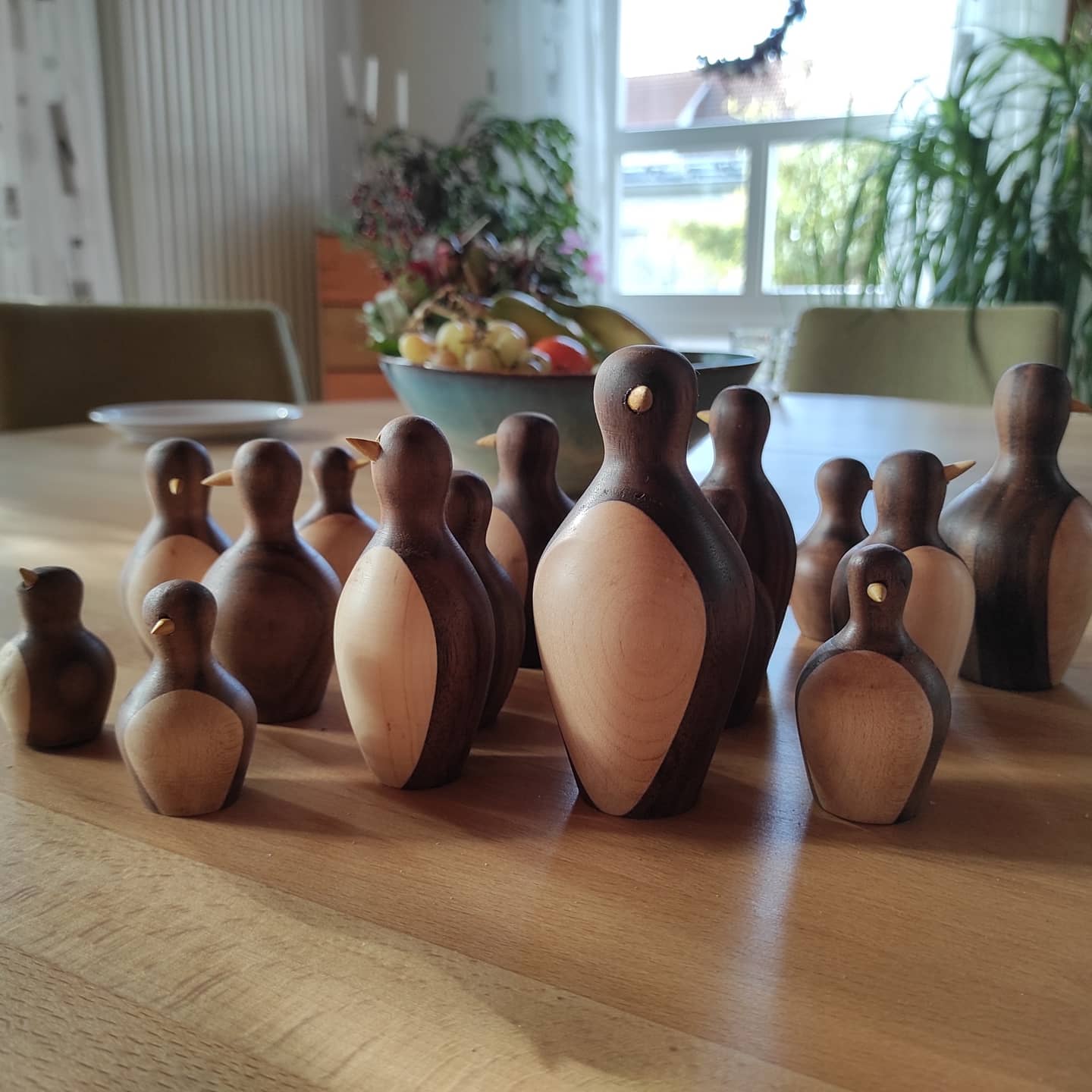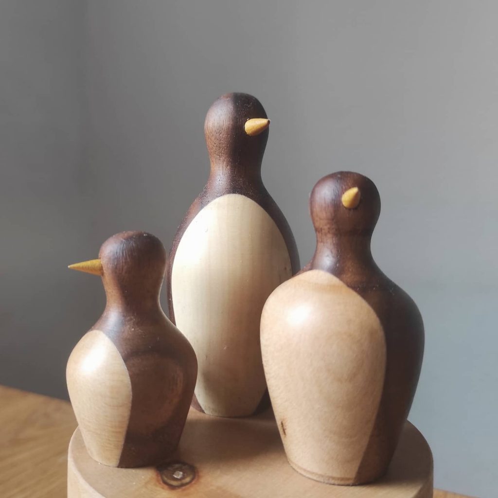Diese Pinguine habe ich als Winter- und Weihnachtsdekoration gedrechselt. Dazu wurden zuerst Kanteln aus Nussbaum und Ahorn/Birne im Verhältnis 4:1 verleimt und dann die Form der Pinguine herausgearbeitet. Der Schnabel wurde aus Maulbeere mittels Dübelplatte hergestellt und dann in die Bohrmaschine eingespannt und spitz geschliffen. Oberflächenbehandlung mit Danish Oil und Bienenwachs.
