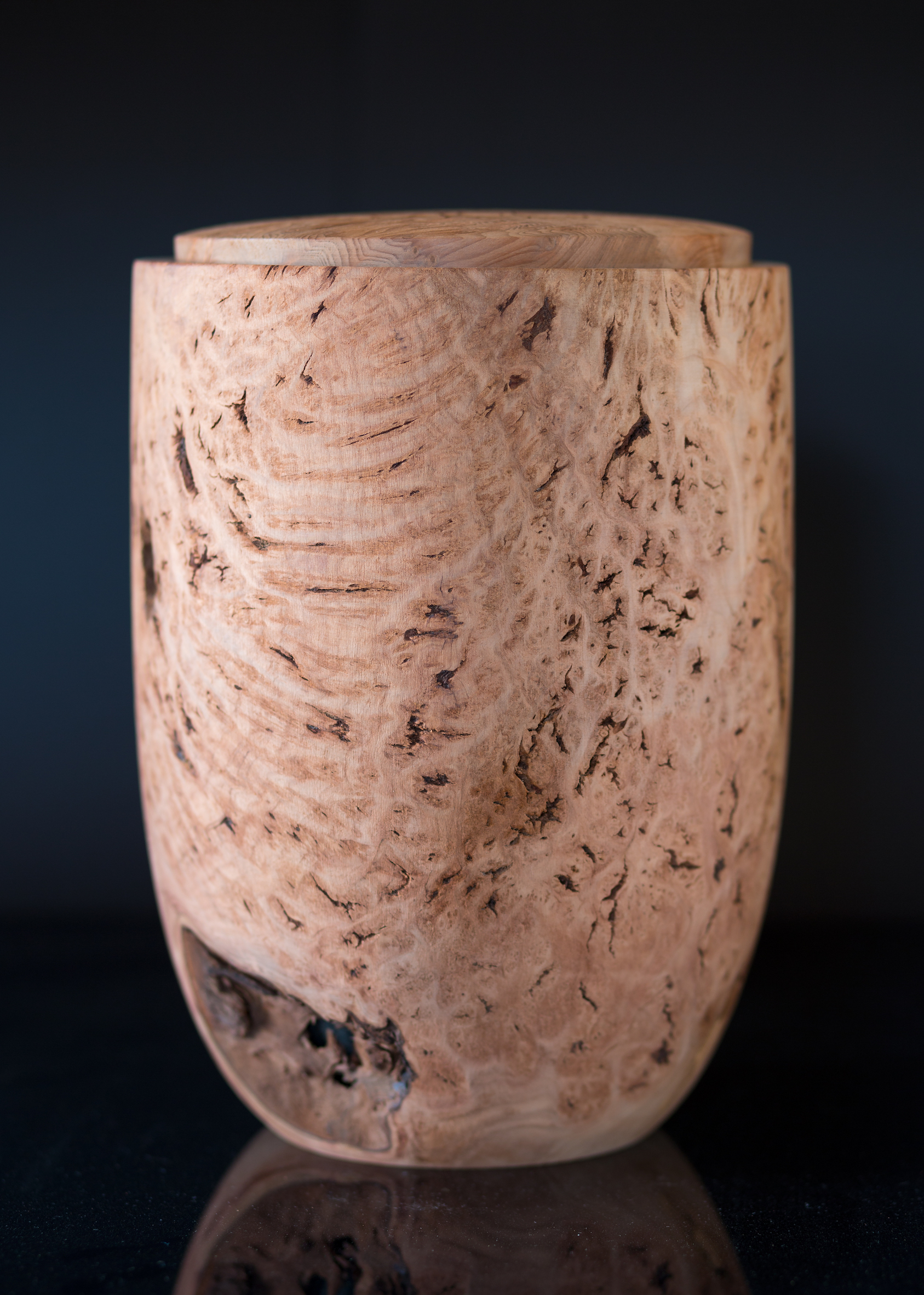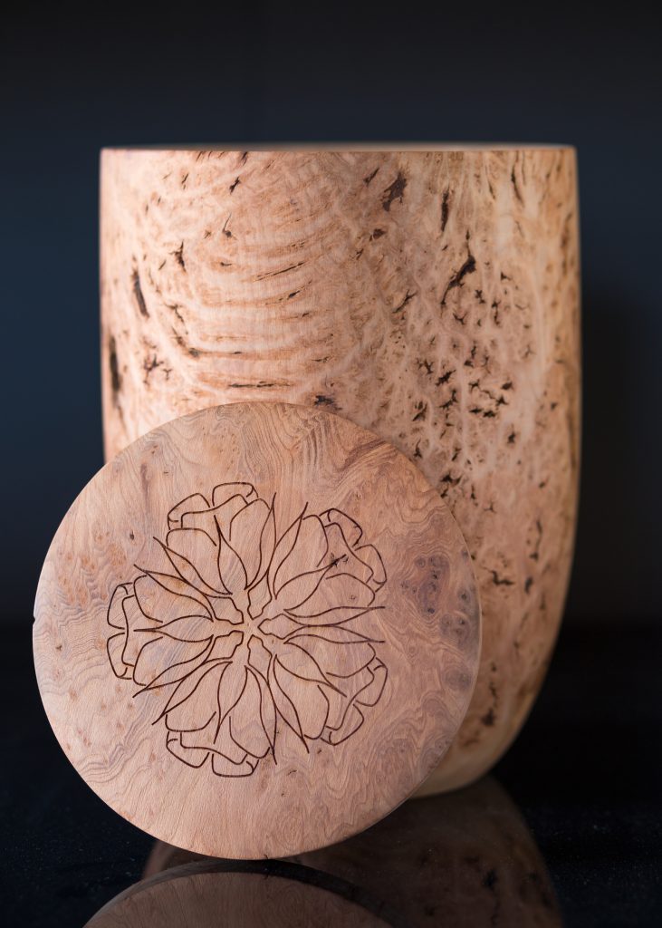 Urne für die Aufbewahrung in einem Kolumbarium. Höhe 30 cm Durchmesser 19,5 cm. Das Ornament im Deckel wurde mit einer Brandtechnik eingraviert. Das verwendete Erdbeerbaumholz befand sich 30 Jahre in meinem Besitz bis es endlich seine Bestimmung gefunden hat. Christoff Guttermann/ Werkstätte für Nützliches und feines, Aachen. Fotos von Damian und Gero Sutmann, B-Raeren.