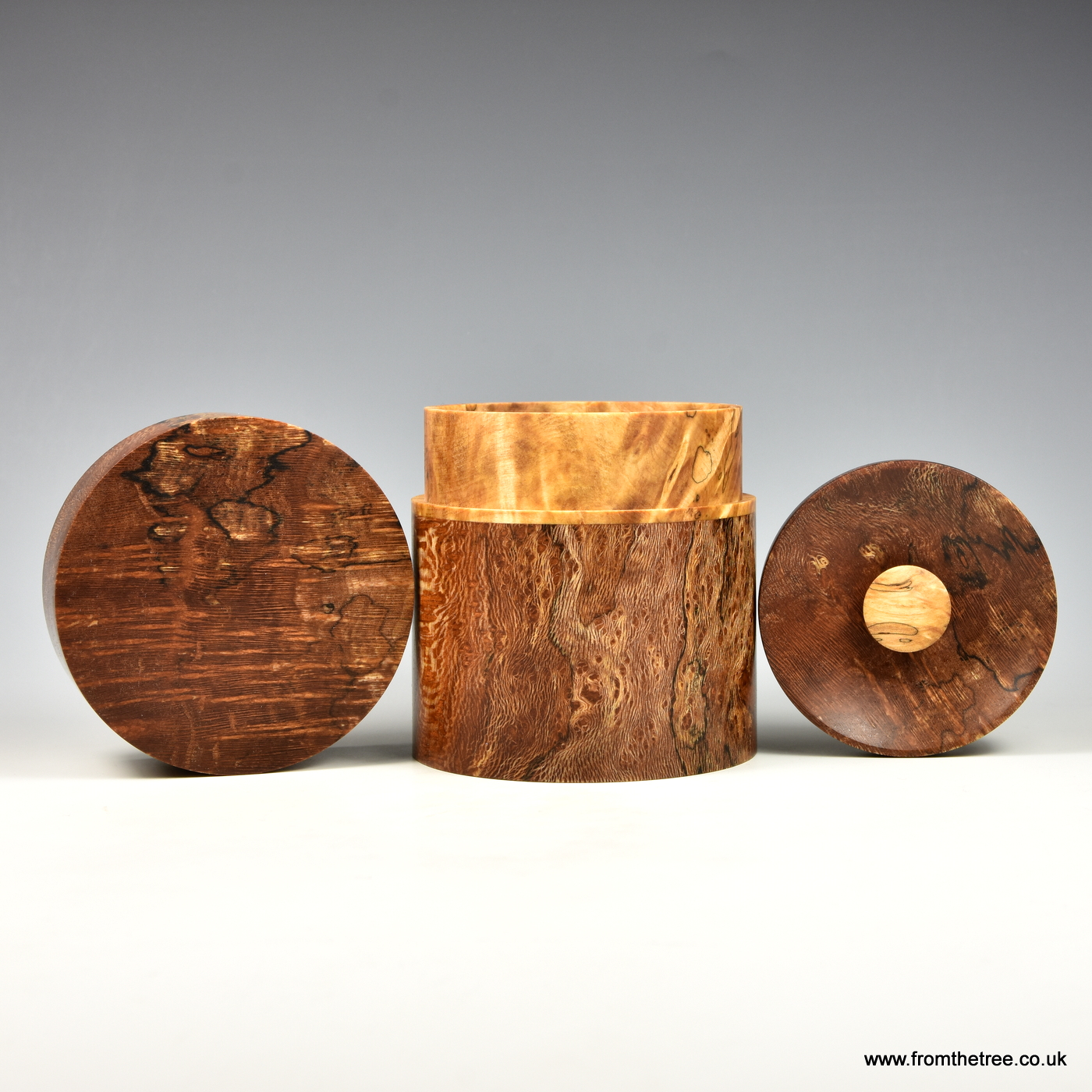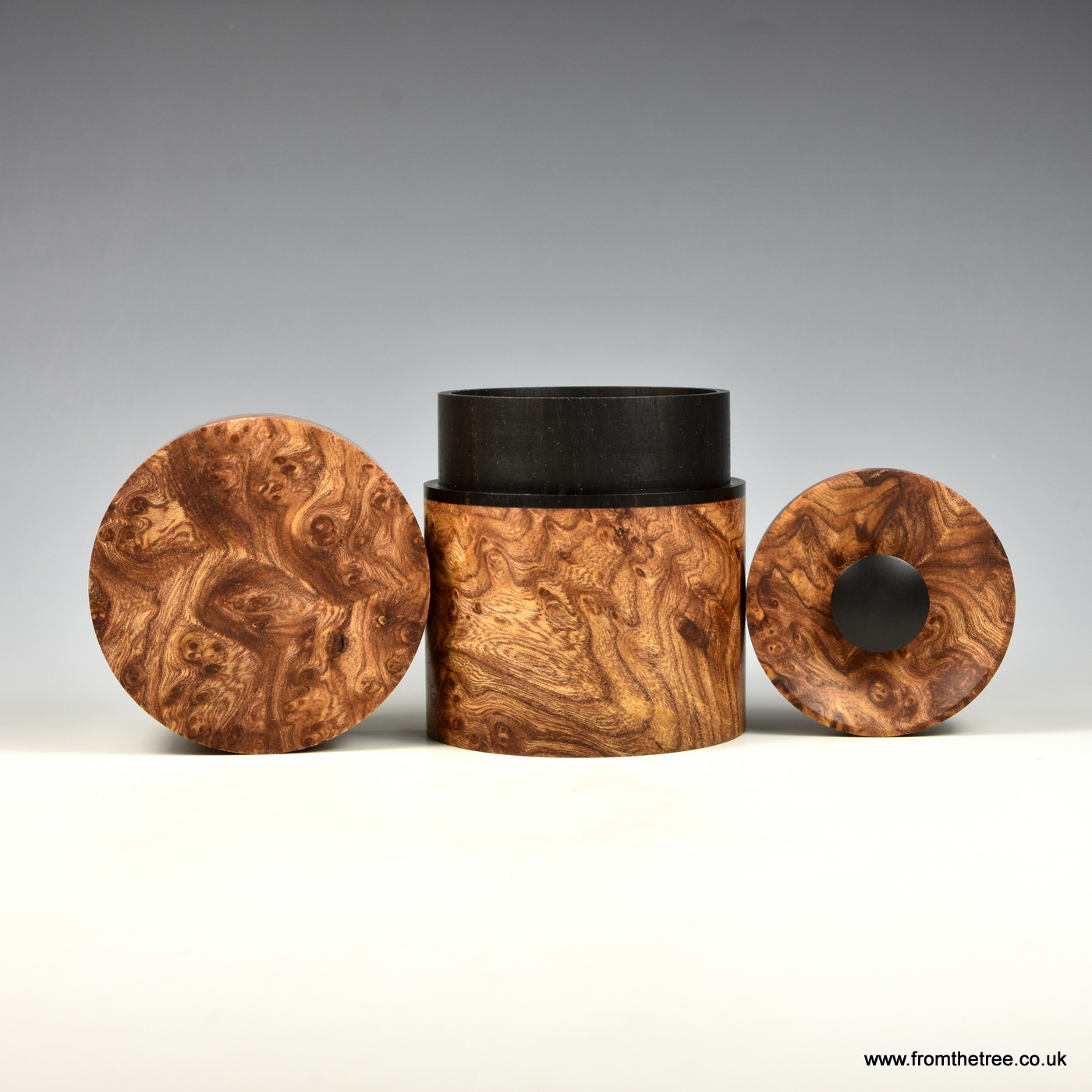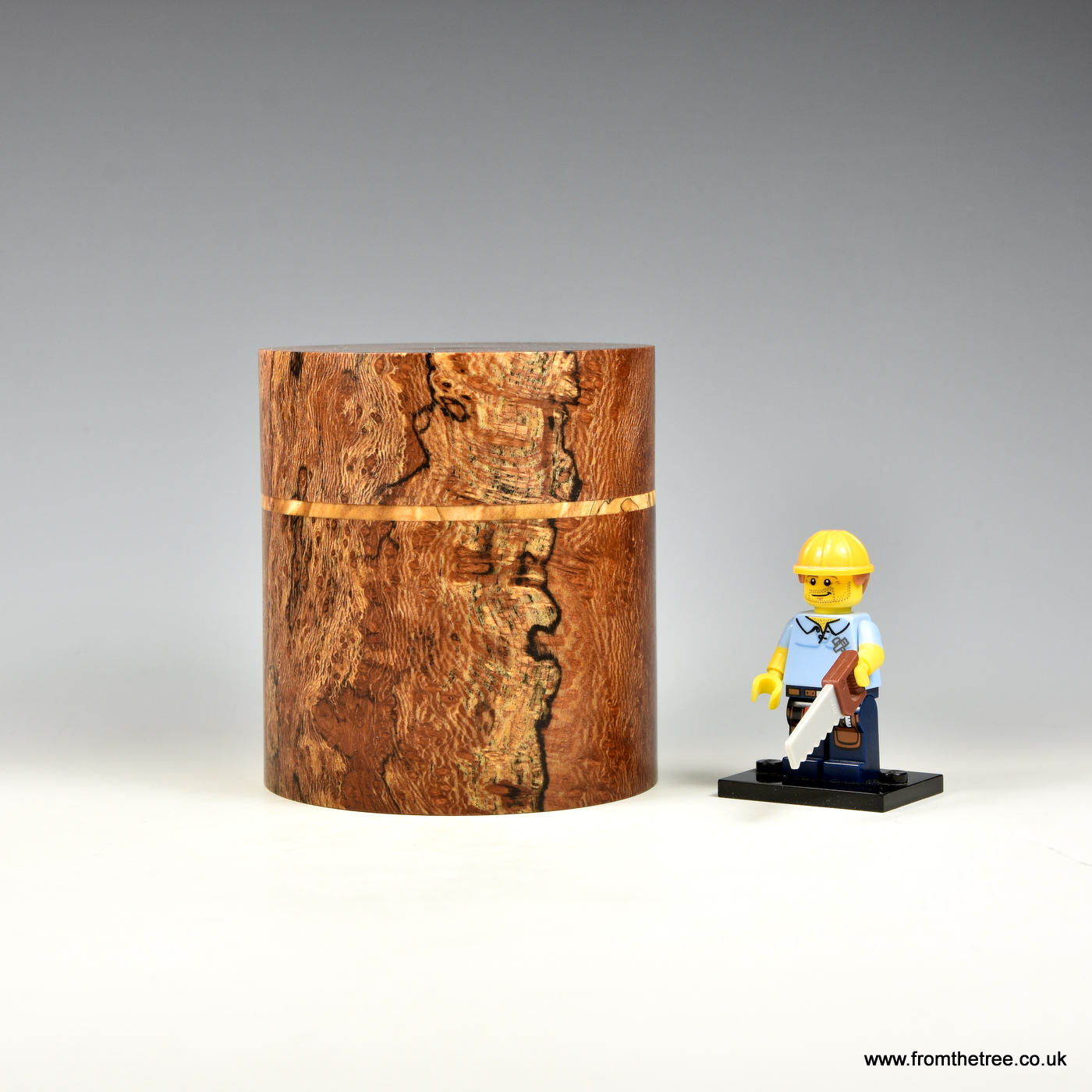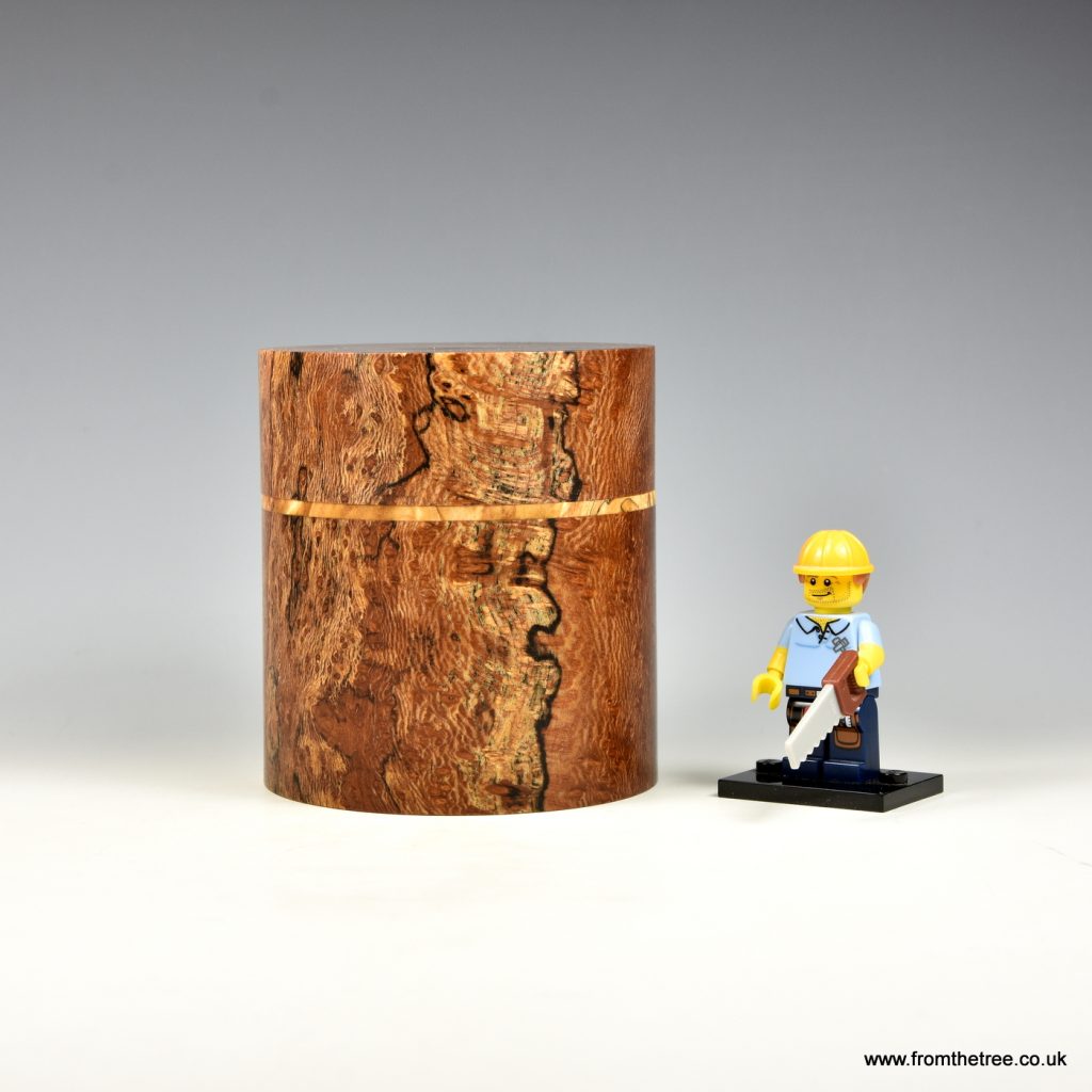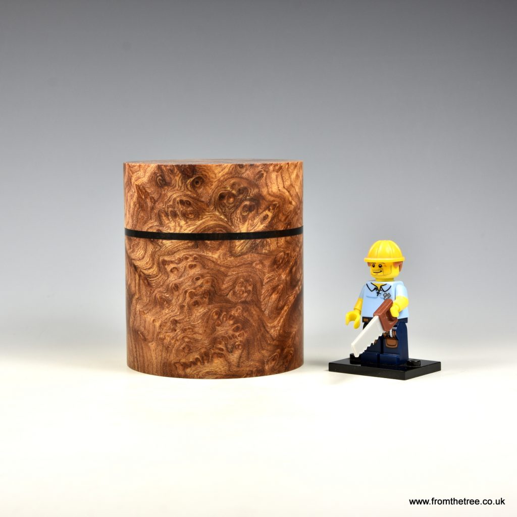 Holz: Eiche geriegelt , Deckel: Goldregenhirnholz mit Griff aus Korkenzieherhasel-Ast. Masse: 11x11x14cm; Oberfläche 2x mit Tungöl von DICTUM eingelassen.
