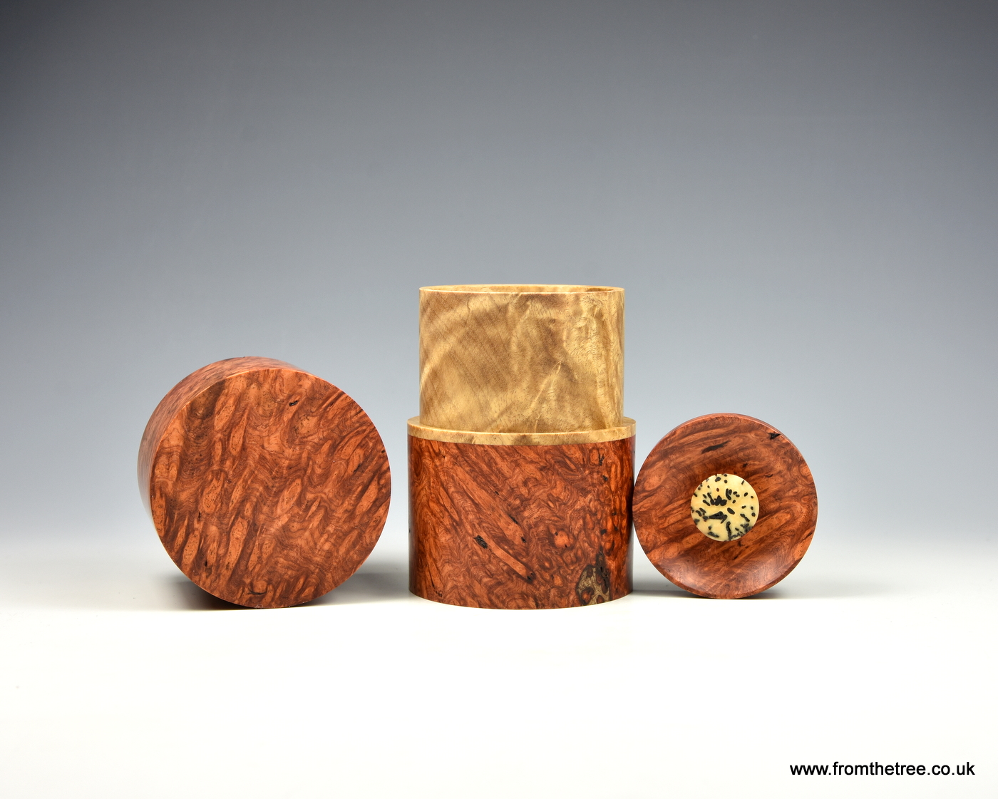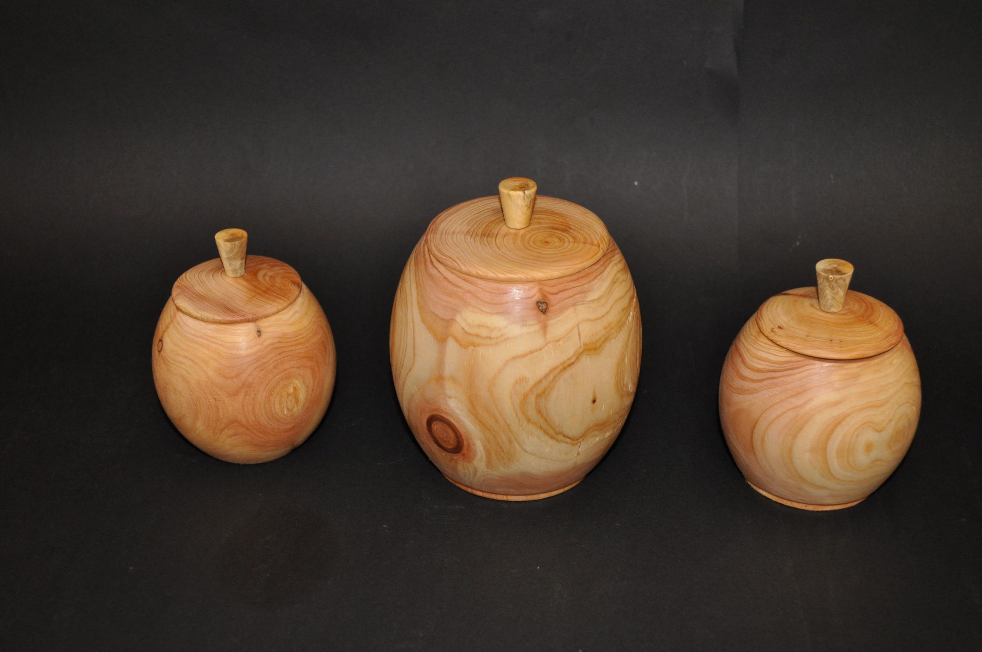 Dosen aus Thuja. Wandstärke 5 mm, Höhe 12 bis 16 cm, ø 7 bis 10 cm, mit Bienenwachs behandelt.