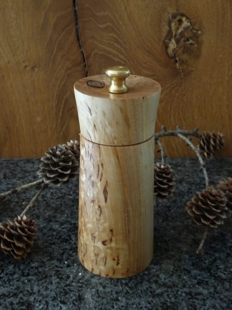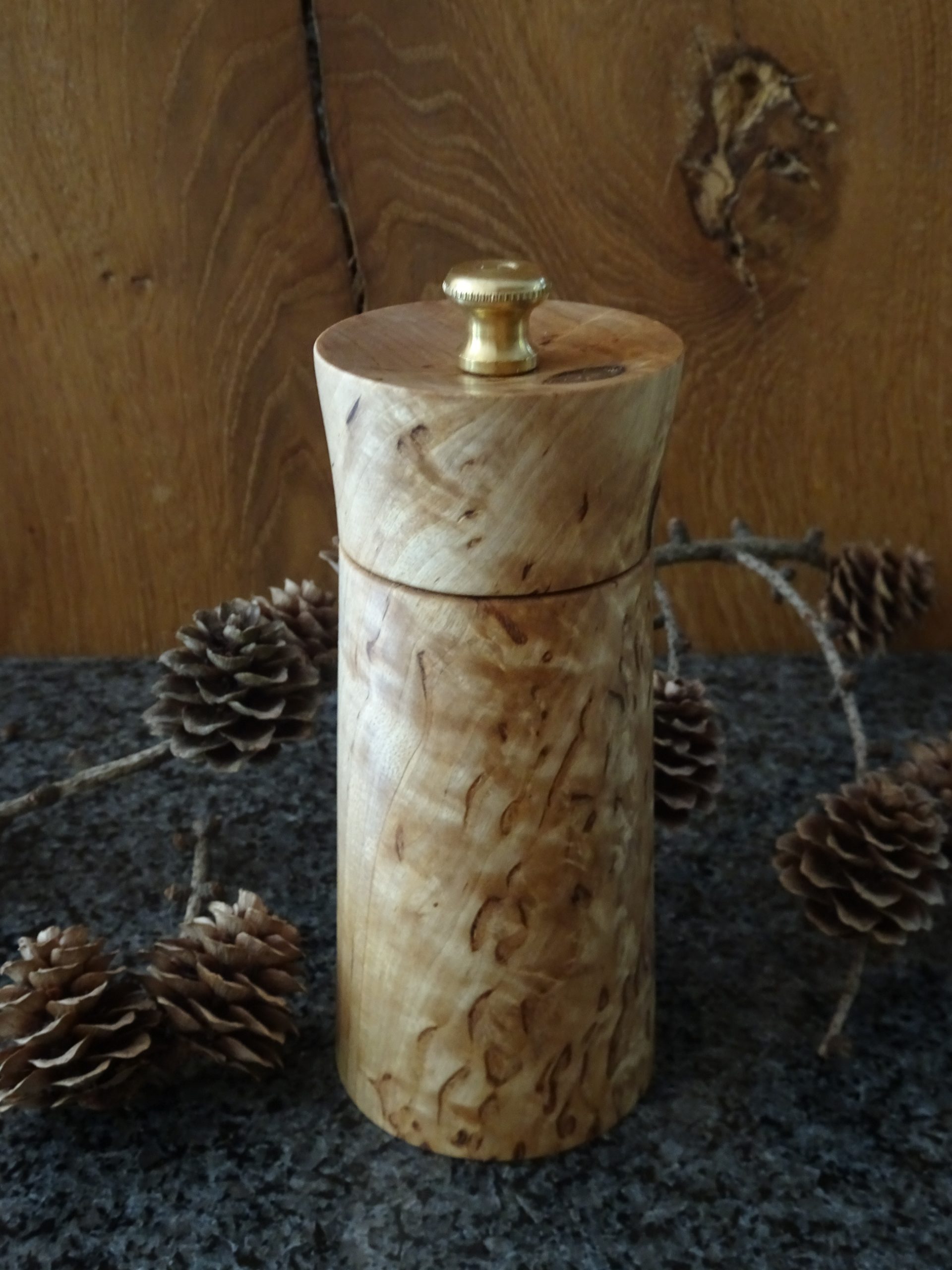 Nachdem ich in 2019 den sehr empfehlenswerten Dictum-Workshop „Salz- und Peffermühlen“ besucht habe, hat meine dort erstellte Pfeffermühle aus Walnussmaserholz jetzt endlich seinen kleinen Bruder in Form einer Salzmühle erhalten. Ich habe mich hierbei für ein Stück Maserbirke und dem Keramikmahlwerk von LIDREWA (130 mm) entschieden, da sich dieses sehr leicht verarbeiten lässt.