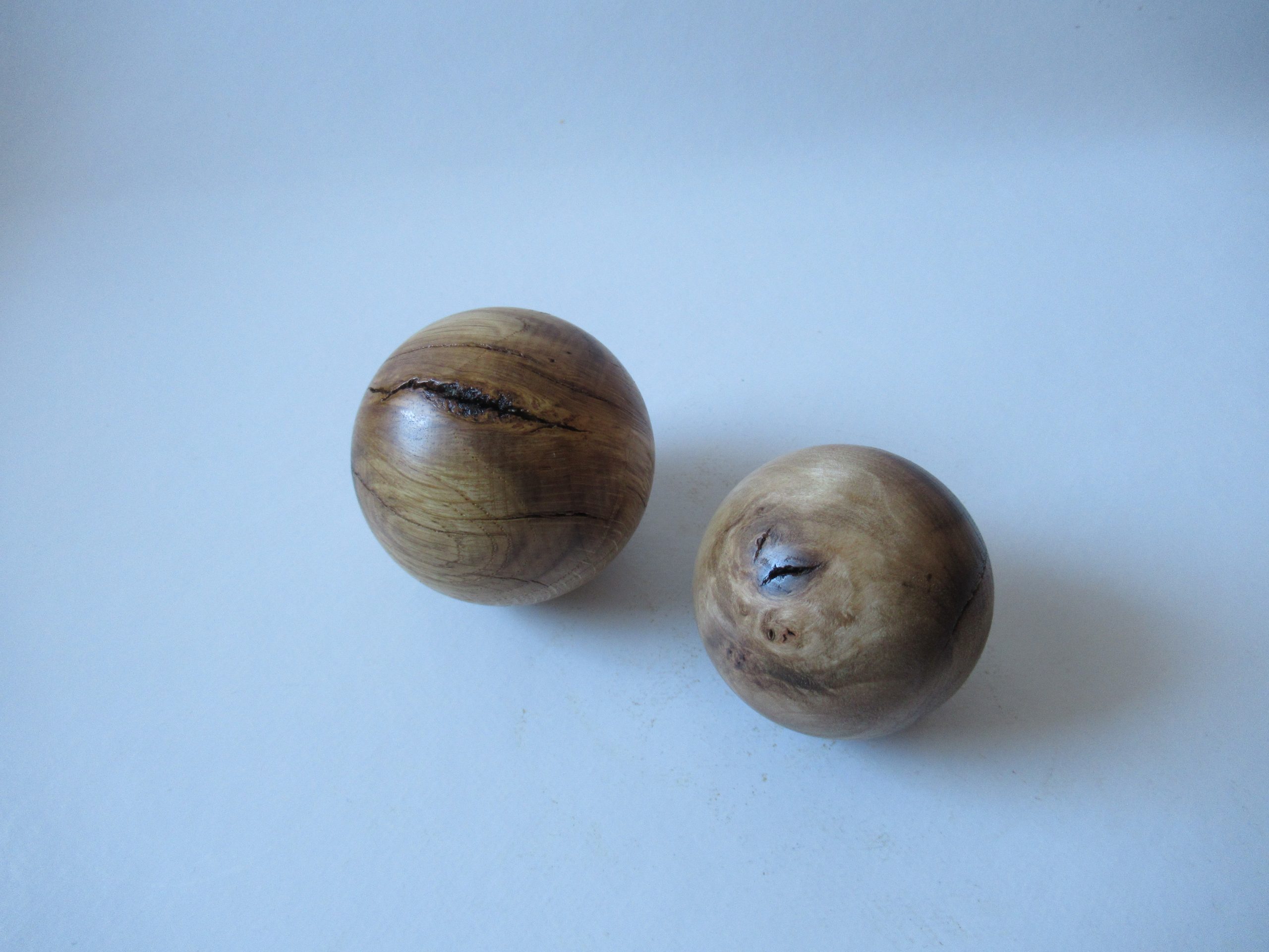 2 Kugeln aus verwachsenem Holz , 1 x Walnuss , 1 x Eiche , 3 x mit Tungöl von DICTUM eingelassen
