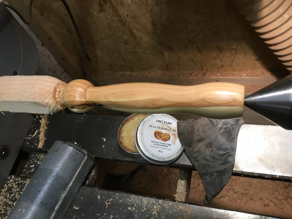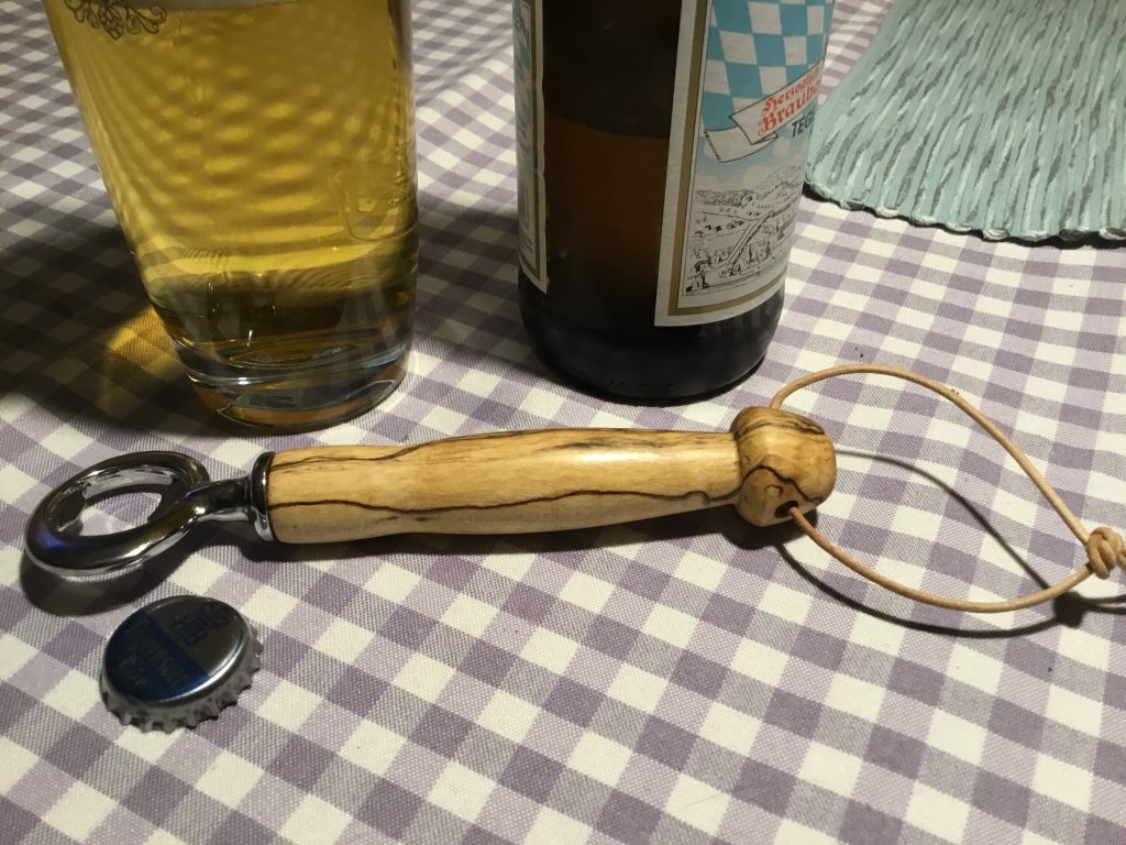 Der Flaschenöffner wurde aus gestockten Ahorn gedrechselt. Die Oberfläche wurde bis Körnung 600 geschliffen und anschließend mit Walnusswachs sowie Walnussöl behandelt. Den Bausatz für den Flaschenöffner, Walnusswachs und Walnussöl gibts bei Dictum!