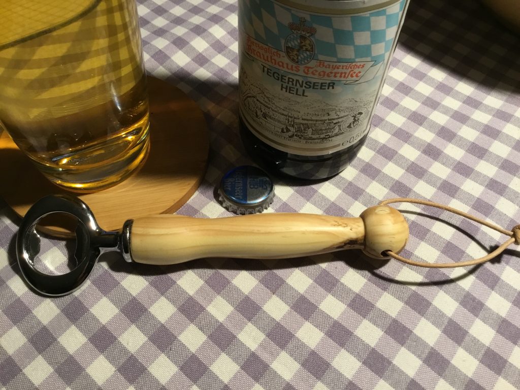 Der Flaschenöffner wurde aus Eibenholz gedrechselt. Die Oberfläche wurde bis Körnung 600 geschliffen und danach mit Walnusswachs sowie Walnussöl behandelt. Den Bausatz Flaschenöffner, Walnusswachs, Walnussöl und das Lederband gibts bei Dictum 👍