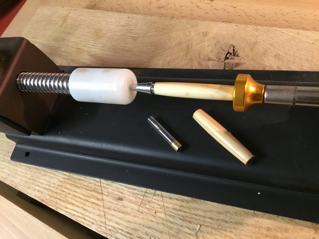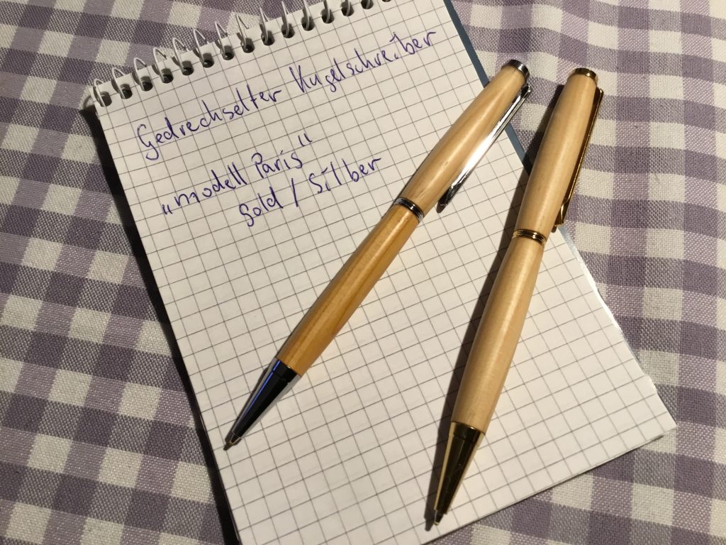 Die Kugelschreiber in Gold und Silber wurden aus Eibenholz gedrechselt. Die Oberfläche wurde bis Körnung 600 geschliffen und danach mit Walnusswachs sowie Walnussöl behandelt. Den Bausatz Modell Paris, Walnusswachs, Walnussöl, sowie die Presse für den Zusammenbau der Kugelschreiber gibts bei Dictum 👍