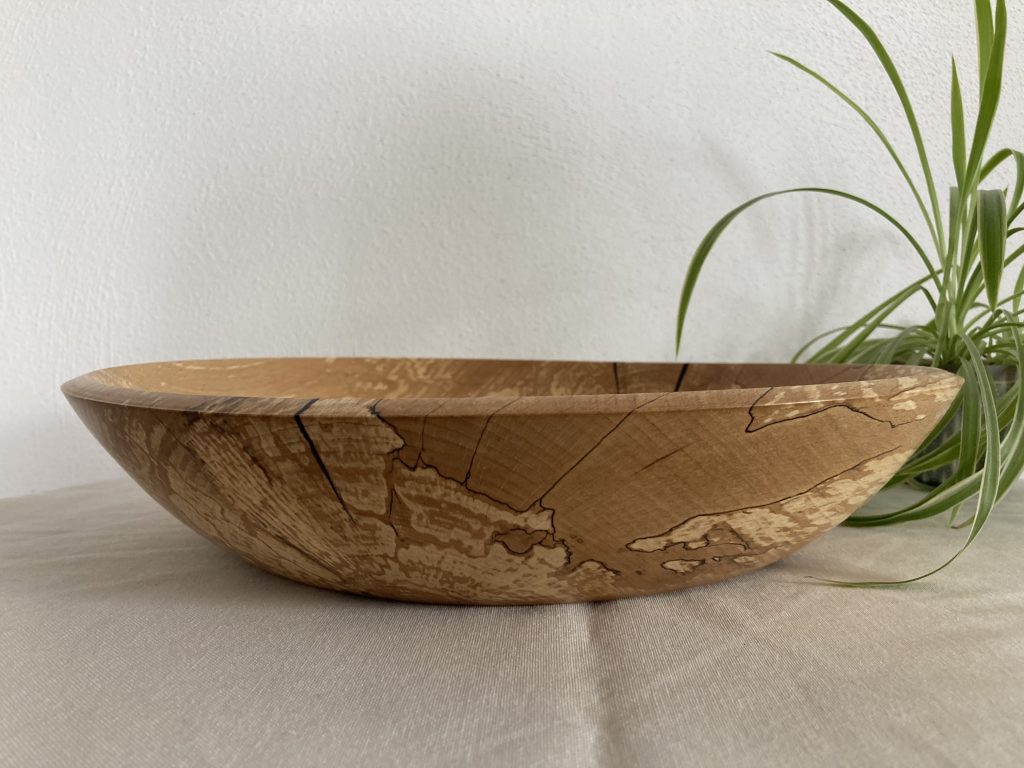 Bei der gerissenen Kernbohle der gestockten Buche wurden die Risse mit EpoxidHarz in transparent Schwarz in mehreren Etappen ausgegossen, da immer wieder was in den Rissen versetzte. Dieser Durchmesser von 37 cm war auf der alten Drehbank nicht mehr machbar, da ist die Hager 300 schon fein. Geschliffen bis Körnung 600 und mit Carnaubawachs/Bienenwachs behandelt.