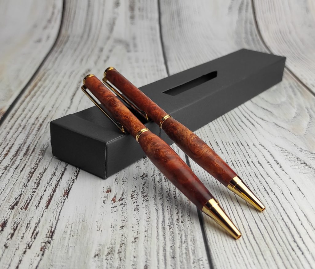 Diese beiden Kugelschreiber habe ich aus einem Stück Amboyna Maserknolle hergestellt. Geschliffen bis Körnung 1500, Oberflächenbehandlung mit CA-Kleber.