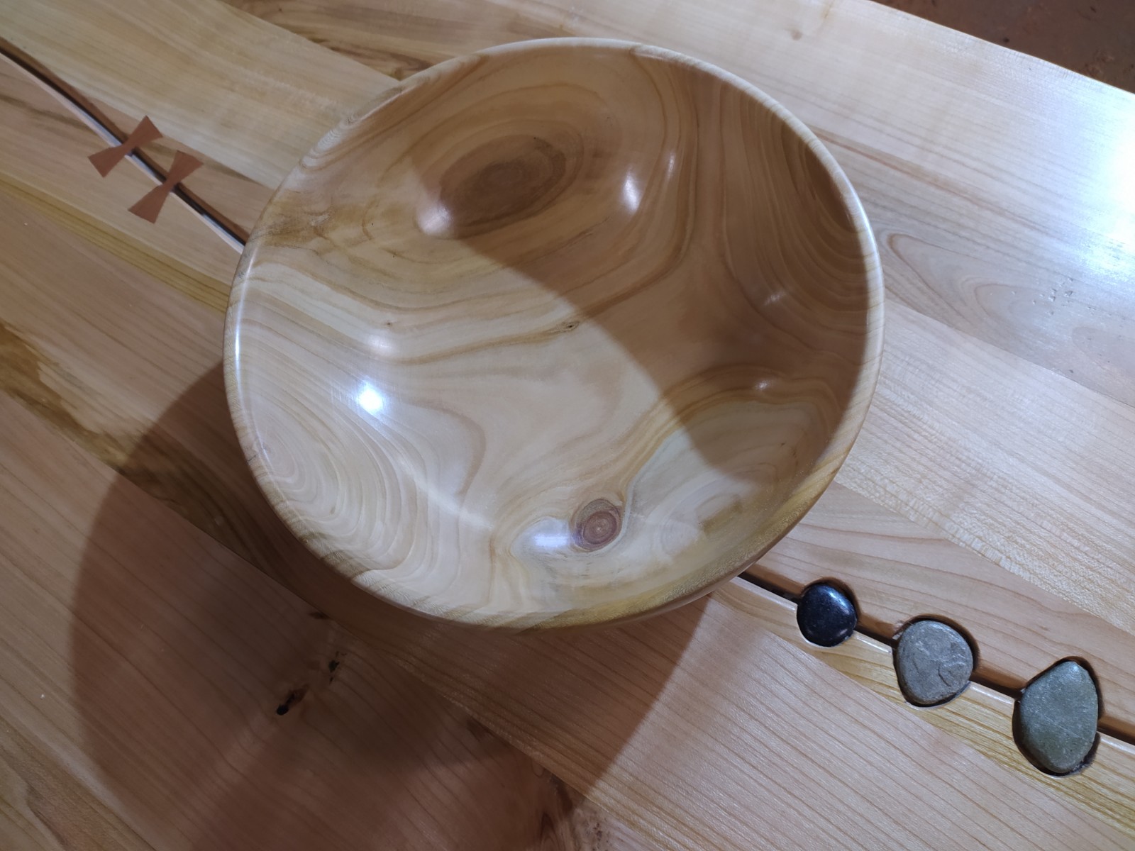 Die Schale wurde aus dem Stamm eines gestockten Kirschbaum gedrechselt. Durchmesser 23 cm, Höhe 10 cm. Die Oberfläche wurde bis Körnung 400 geschliffen und zum Schluss mit Danish Oil behandelt.