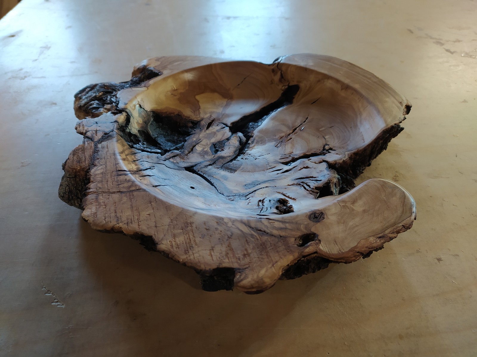 Schale aus Olivenstamm, behandelt mit Danish Oil. Durchmesser 30 cm.