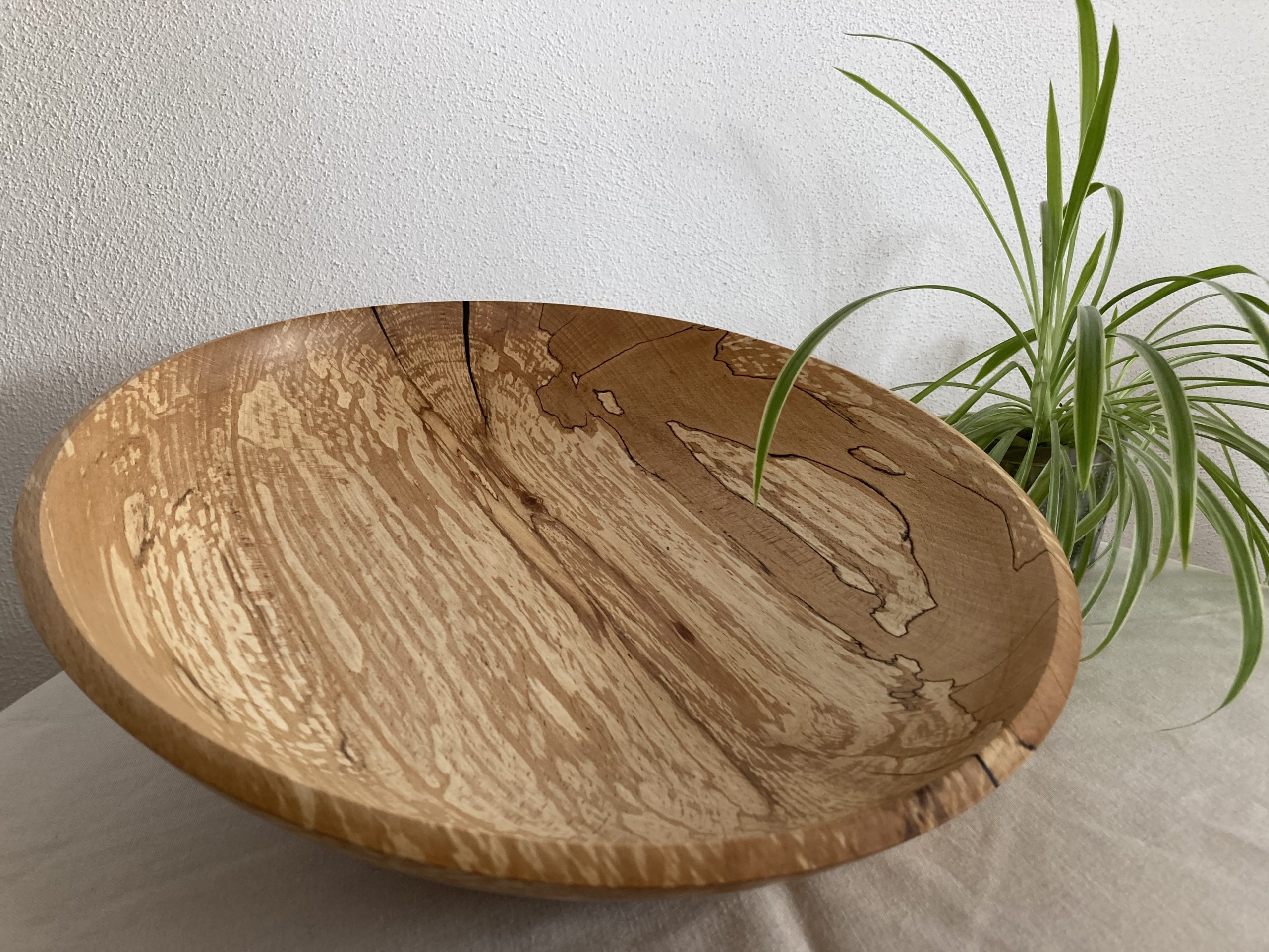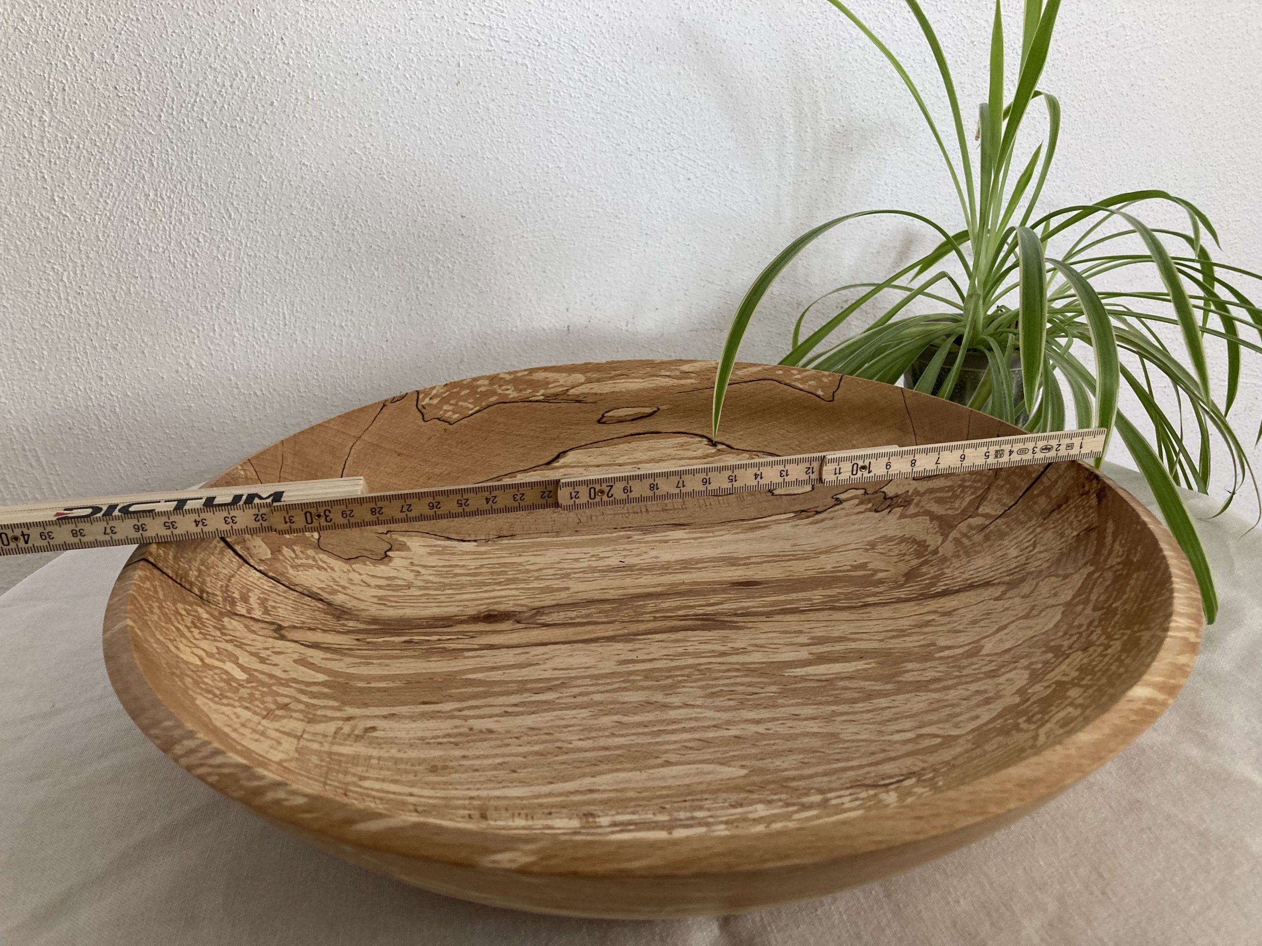 Bei der gerissenen Kernbohle der gestockten Buche wurden die Risse mit EpoxidHarz in transparent Schwarz in mehreren Etappen ausgegossen, da immer wieder was in den Rissen versetzte. Dieser Durchmesser von 37 cm war auf der alten Drehbank nicht mehr machbar, da ist die Hager 300 schon fein. Geschliffen bis Körnung 600 und mit Carnaubawachs/Bienenwachs behandelt.