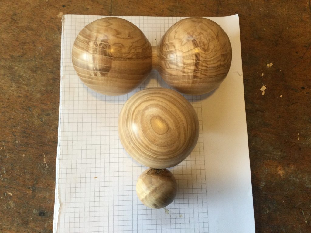 Die Kugeln haben einen Durchmesser von 8 cm, die kleine 4 cm. Das Material ist Esche. Sie wurden mit Bienenwachs versiegelt.