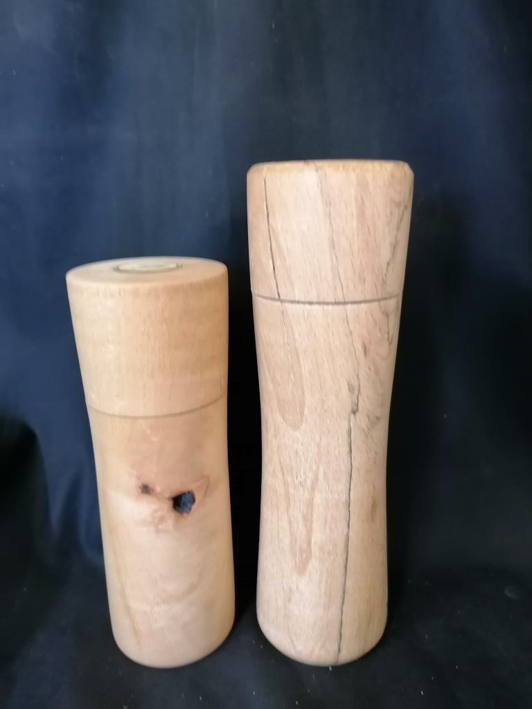 Ich habe hier aus gestockter Buche eine Pfeffermühle mit ca 20cm Länge und eine Salzmühle aus Buchenholz mit ca 15cm Länge gedrechselt. Die Oberfläche habe ich bis zur Körnung 600 geschliffen und es wurde ein Crush Grind Mahlwerk verwendet. Zur besseren Erkennung habe ich mit meinem Laser kleine Plättchen ausgeschnitten und graviert.