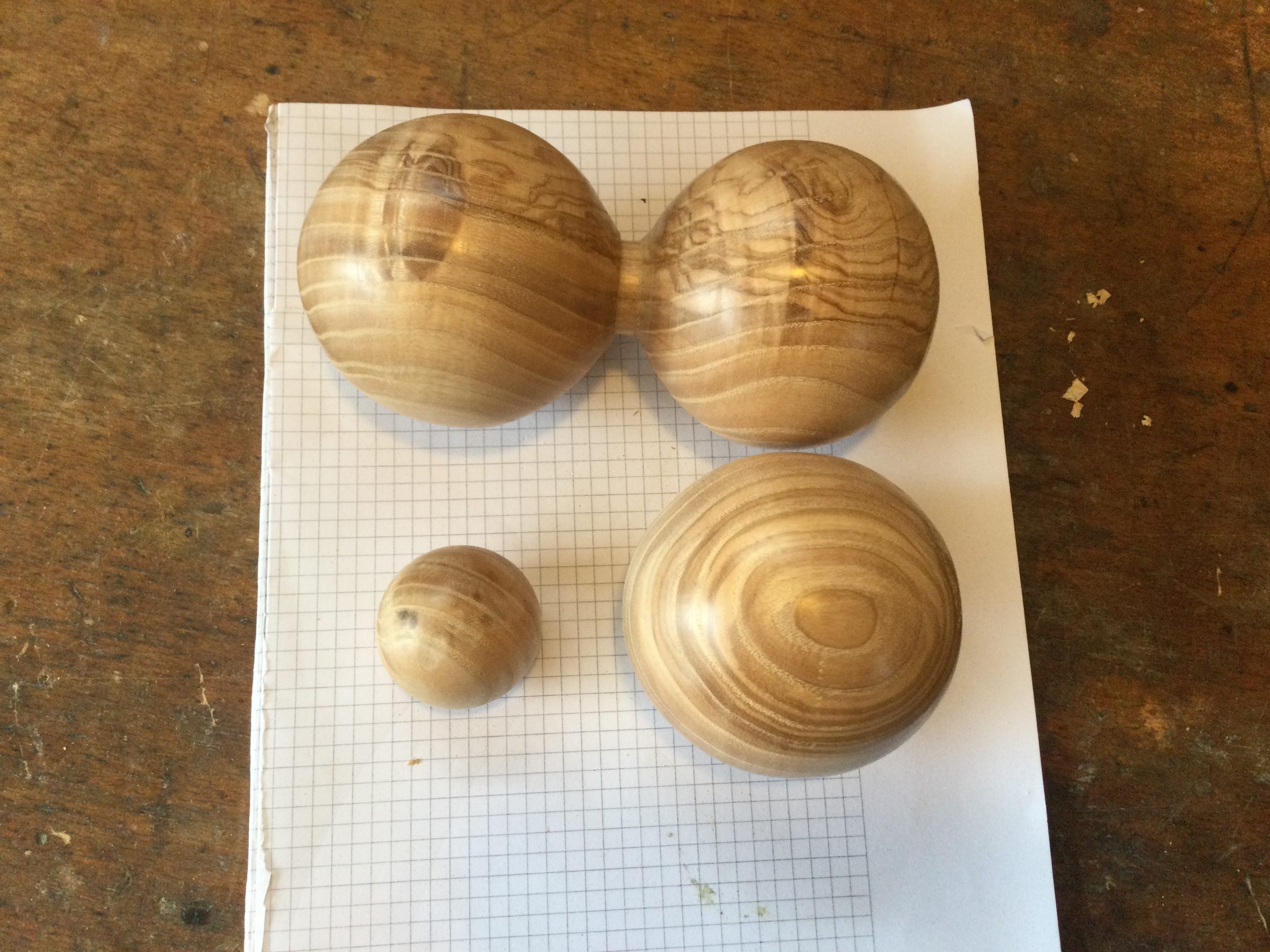 Die Kugeln haben einen Durchmesser von 8 cm, die kleine 4 cm. Das Material ist Esche. Sie wurden mit Bienenwachs versiegelt.