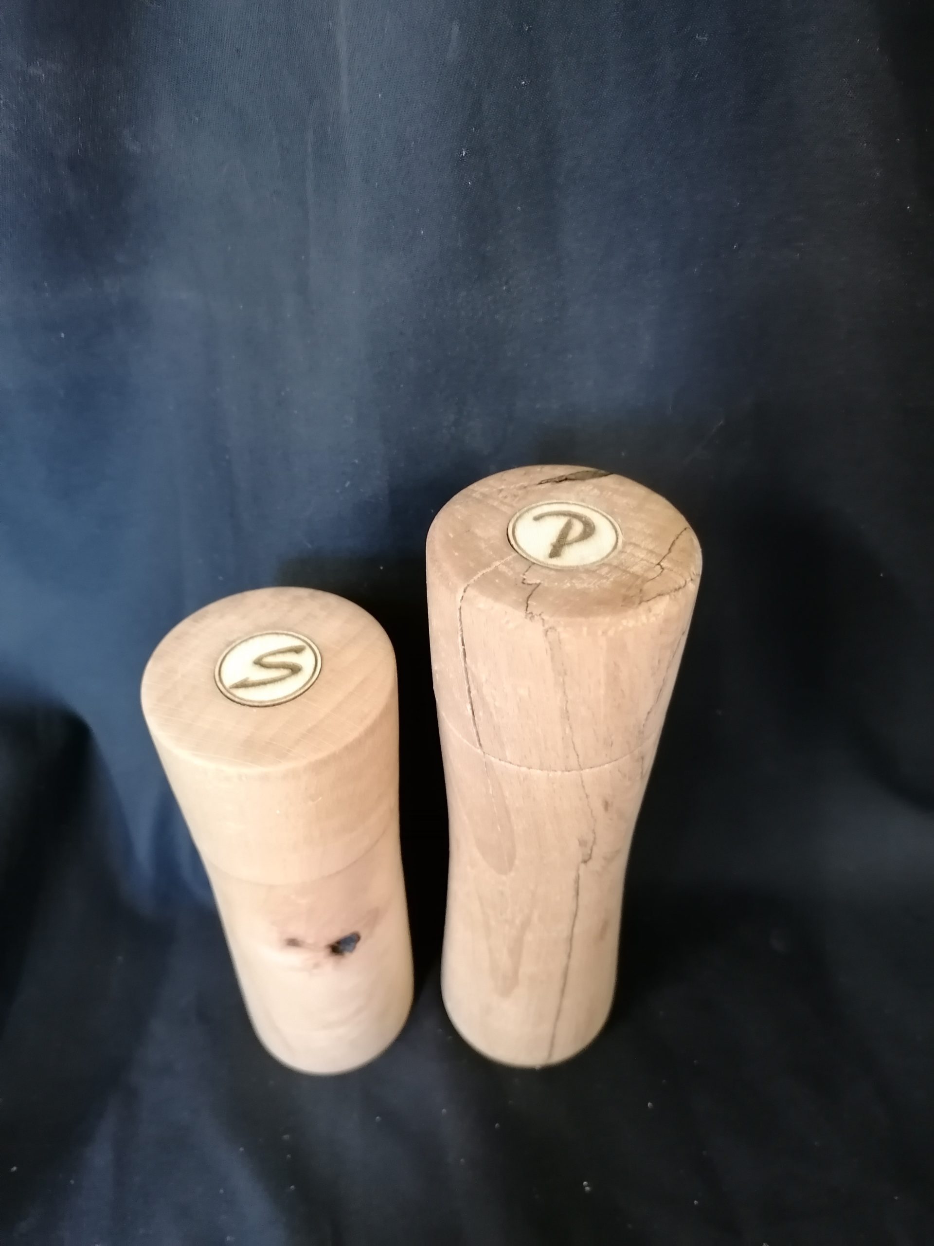 Ich habe hier aus gestockter Buche eine Pfeffermühle mit ca 20cm Länge und eine Salzmühle aus Buchenholz mit ca 15cm Länge gedrechselt. Die Oberfläche habe ich bis zur Körnung 600 geschliffen und es wurde ein Crush Grind Mahlwerk verwendet. Zur besseren Erkennung habe ich mit meinem Laser kleine Plättchen ausgeschnitten und graviert.