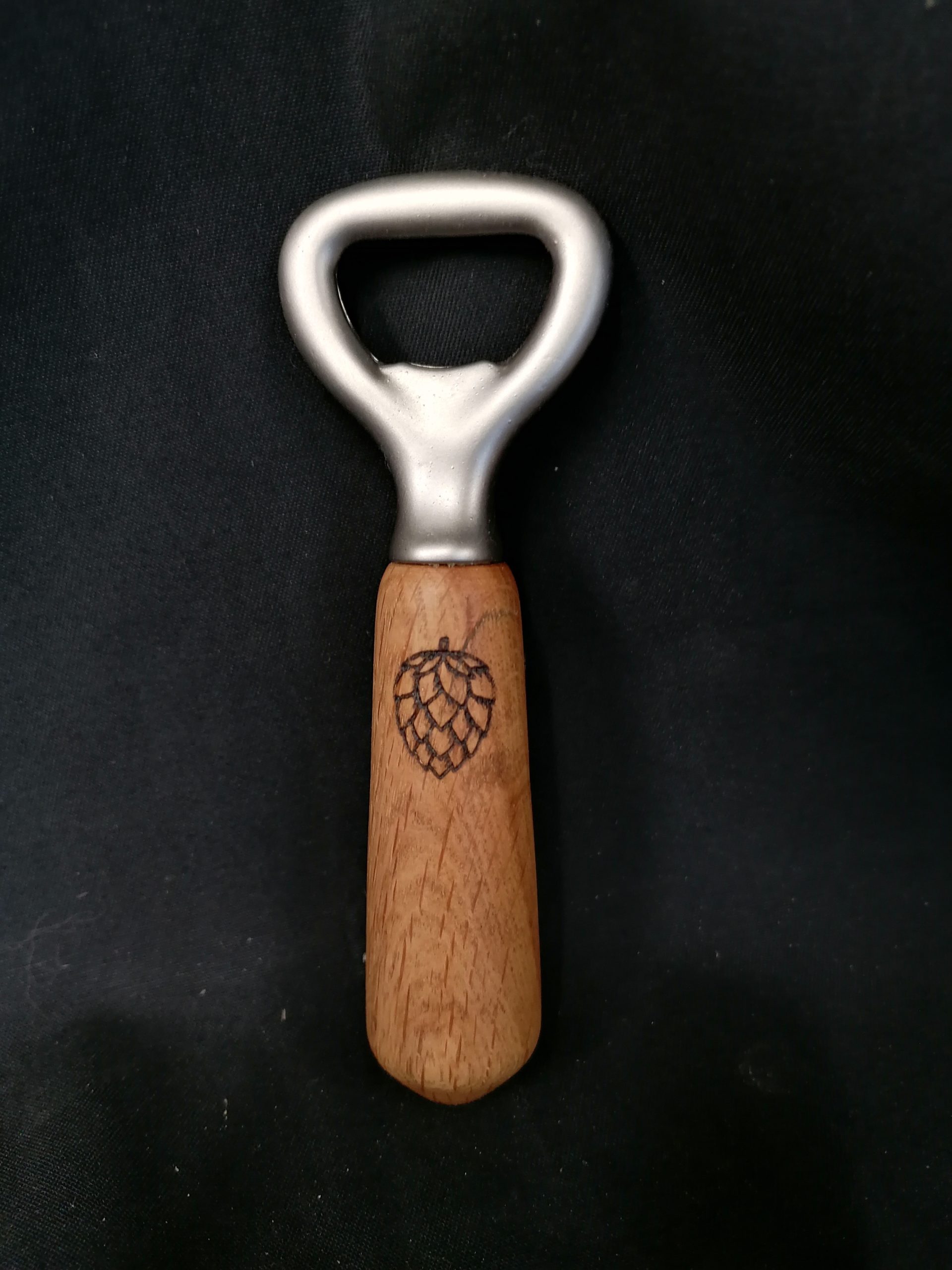 Ich habe für einen Arbeitskollegen einen Flaschenöffner aus Eichenholz gedrechselt. Als Highlight habe ich noch ein Hopfensymbol eingraviert. Die Oberfläche wurde mit einer Mischung aus Bienenwachs, Leinöl und Orangenöl versiegelt.