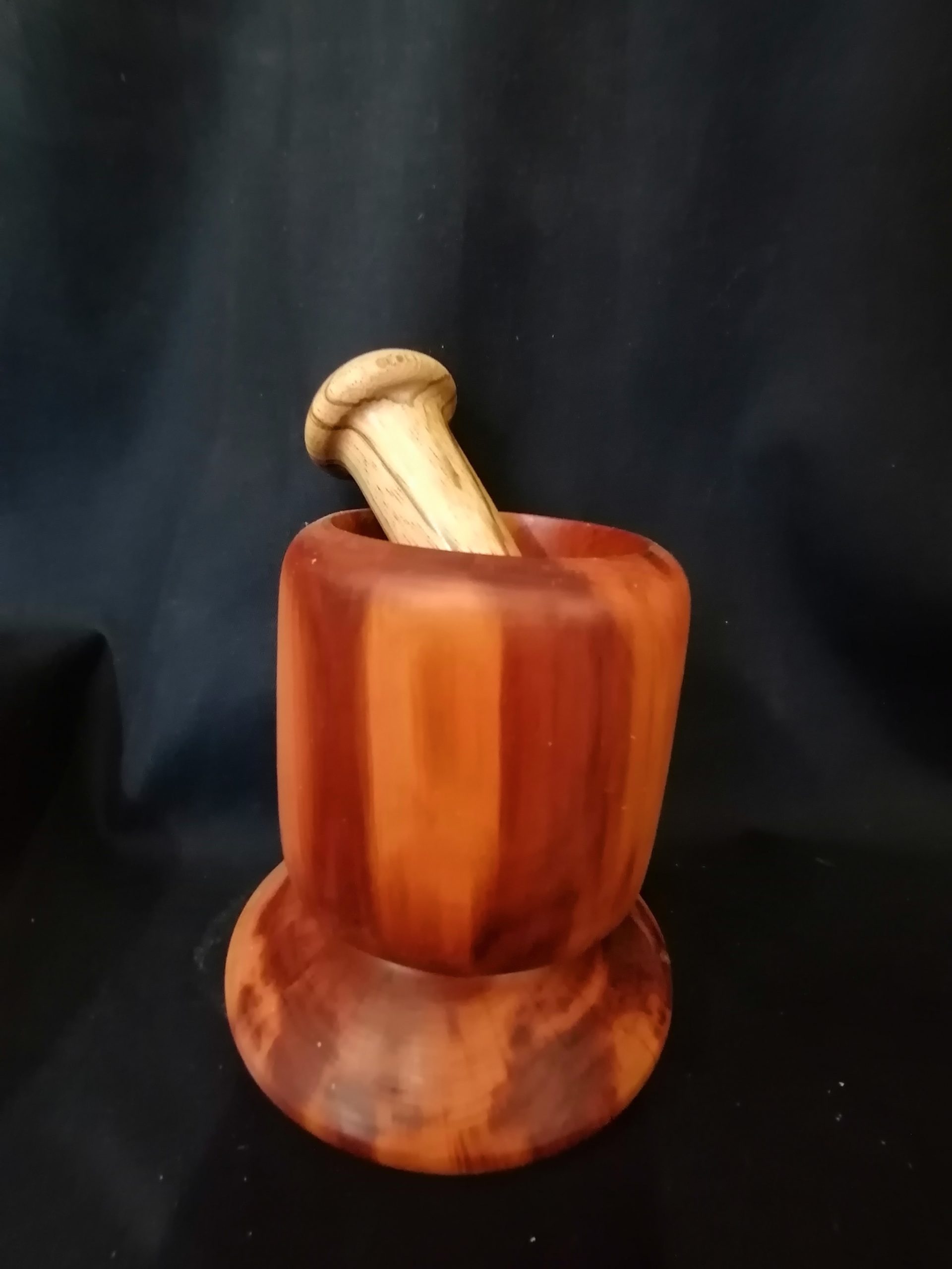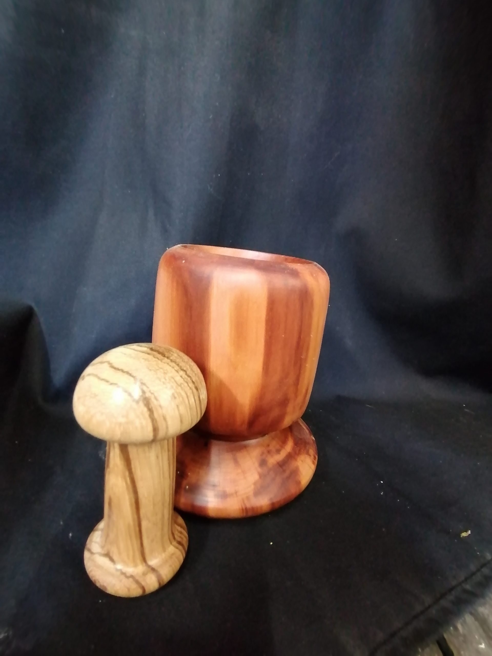 Ich habe aus einem kleinen Stück Pflaumenholz einen Mörser gedrechselt. Der Stößel ist aus Zebranoholz. Die Oberfläche wurde bis Körnung 800 geschliffen und mit einer Lebensmittelechten Wachsmischung versiegelt.