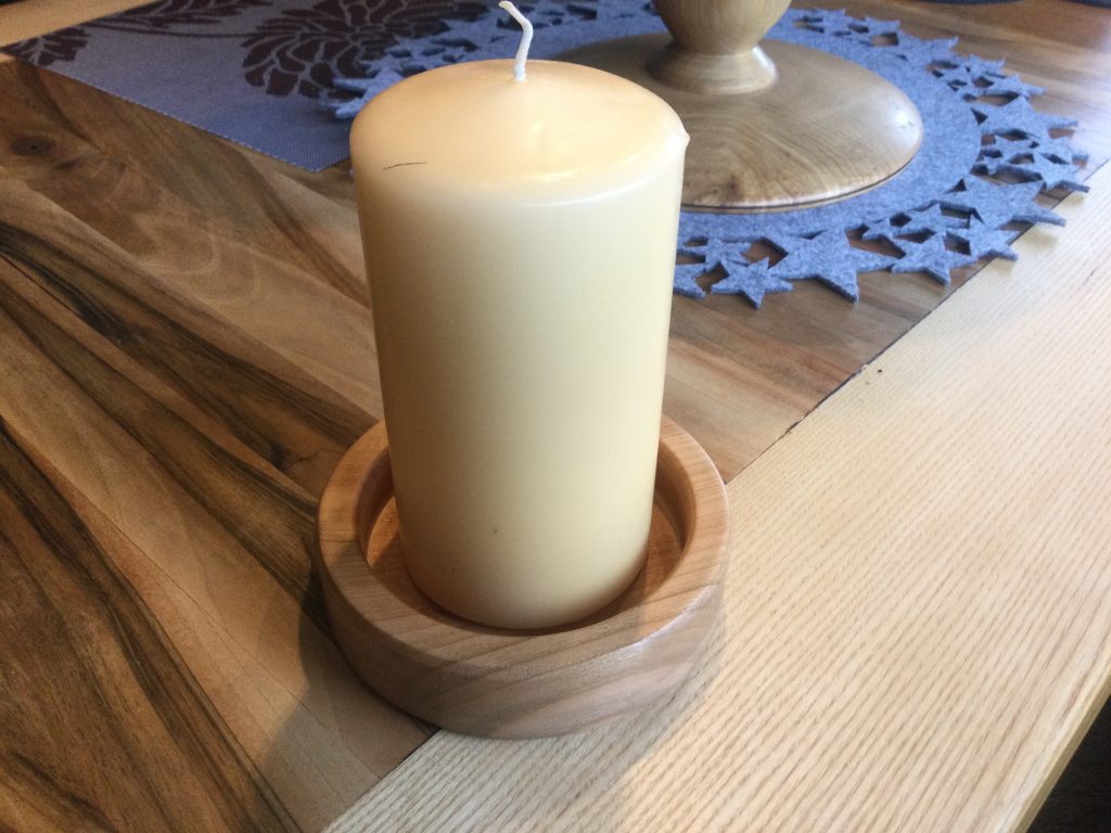 Der Kerzenuntersetzer ist aus Kirsche, und mit Bienenwachs versiegelt worden. Er ist 3 cm hoch und 10 cm im Durchmesser. Die Tiefe beträgt 2 cm.