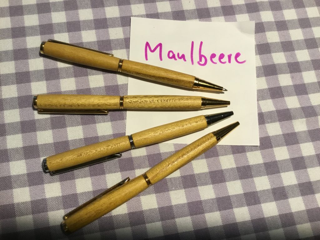 Die Kugelschreiber wurden aus dem Holz der Maulbeere gedrechselt. Bausatz war das Modell Paris. Die Oberfläche wurde bis Körnung 600 geschliffen und abschließend mit Walnusswachs und Walnussöl behandelt.