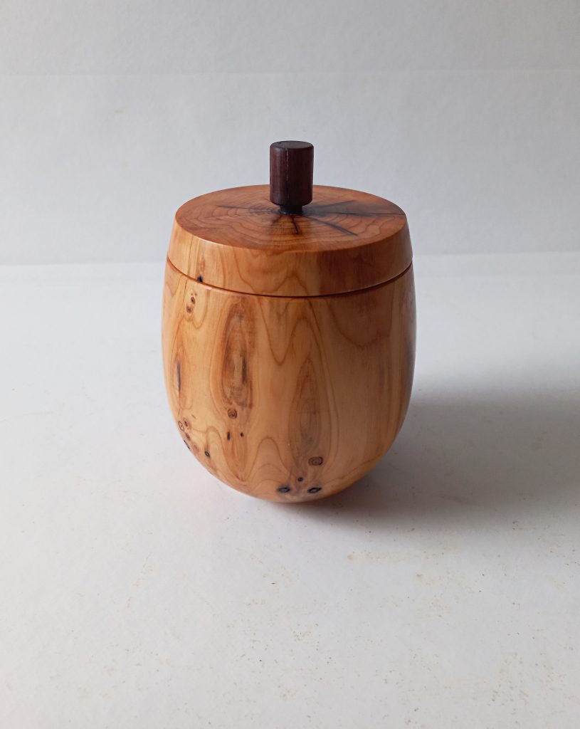 Dose aus gestockter Birke mit Kugeldeckel aus Lärche 8 x 18 cm , geschliffen bis Körnung 400 und 3 x mit Tungöl von DICTUM eingelassen.