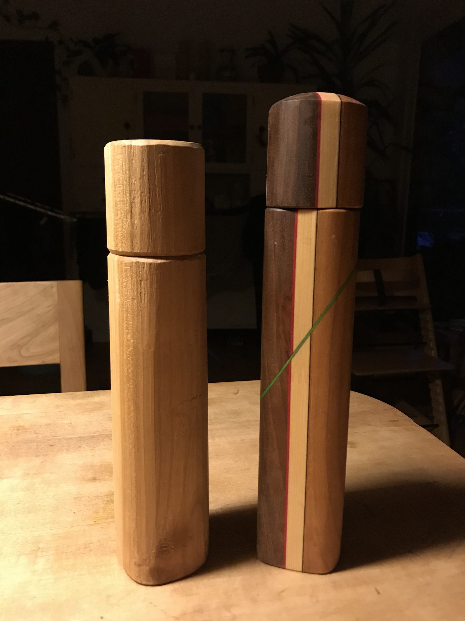 Salzmühlen aus Holzresten, Crush Grind Mahlwerk, mit Säulenbohrmaschine, Handhobel und Schweifhobel!