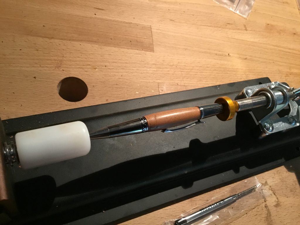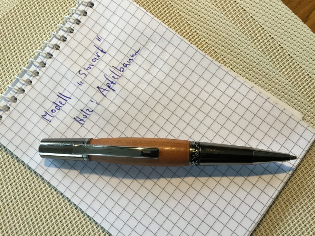Der Kugelschreiber wurde aus Apfelholz gedrechselt. Die Oberfläche wurde bis Körnung 600 geschliffen und abschließend mit Walnusswachs und Walnussöl behandelt. Bausatz Smart, Walnussöl, Walnusswachs, sowie die Kugelschreiberpresse (ideal beim Zusammenfügen des Bausatz) gibts bei Dictum!
