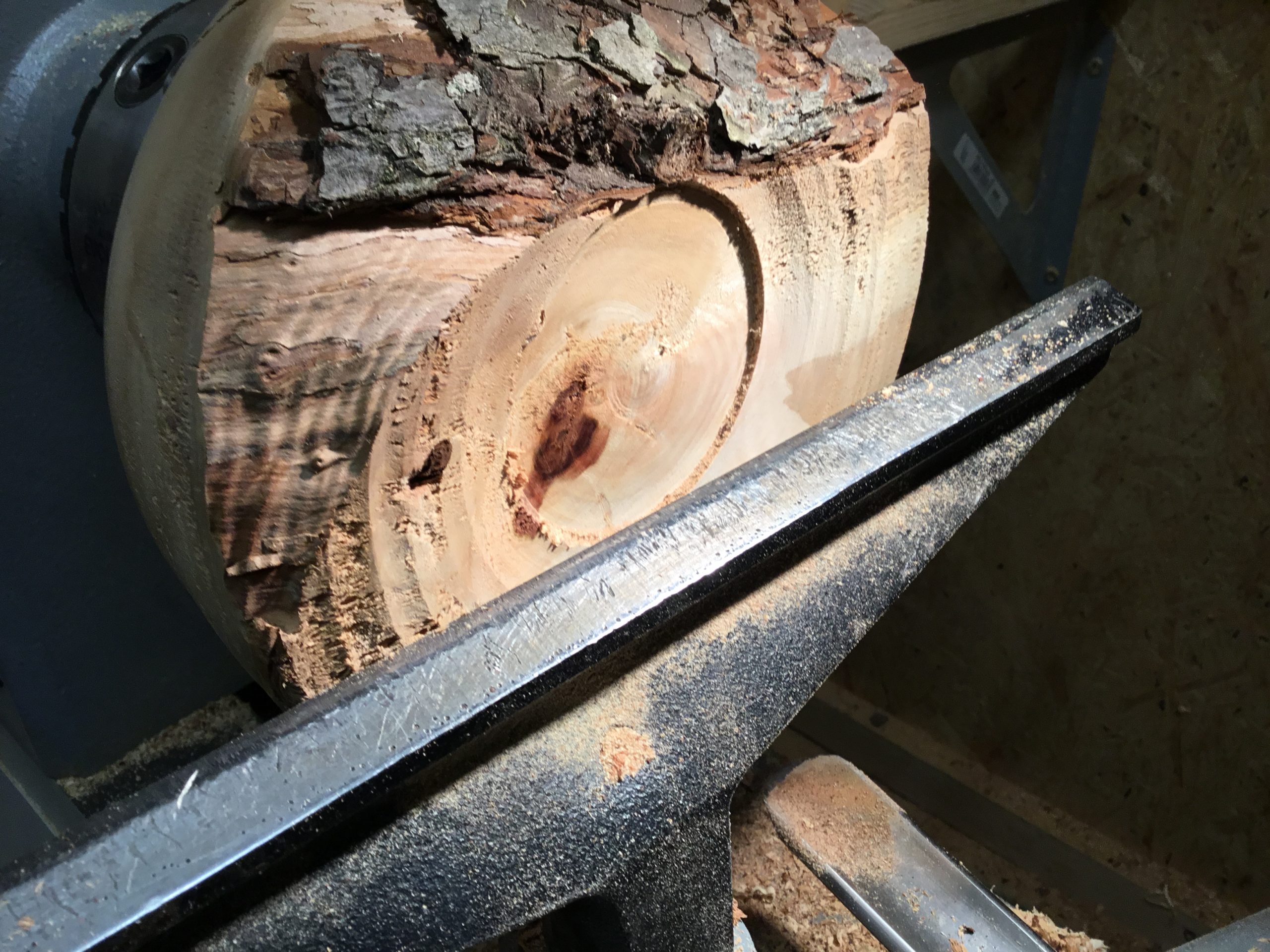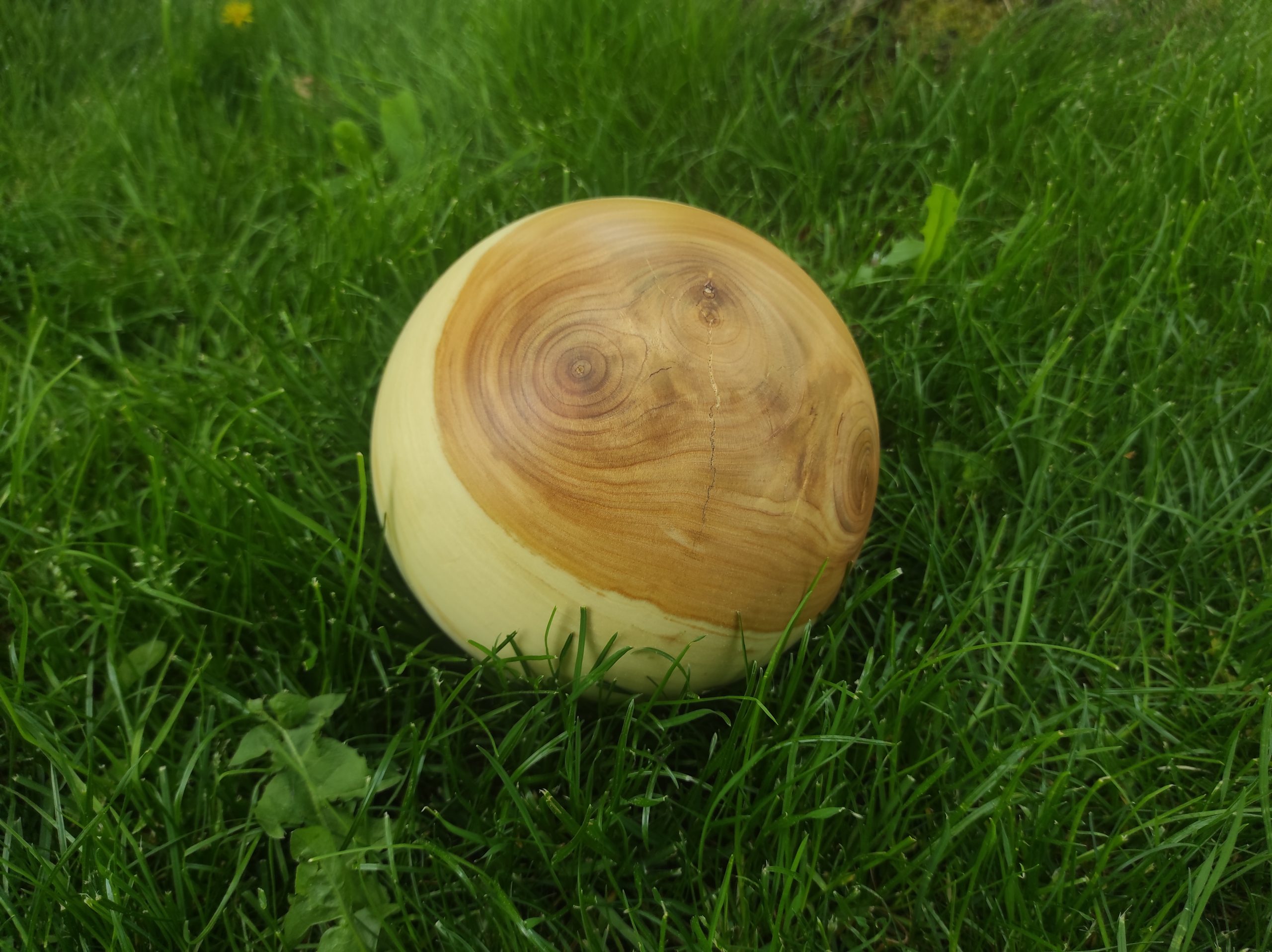 Diese Kugel mit einem Durchmesser von 20 cm habe ich Freihand aus einem frischen Kirschbaum-Stamm gedrechselt. Die Oberfläche wurde direkt bis Körnung 240 geschliffen und mit Schellack behandelt, nach dem Trocknen wird die Kugel noch feiner geschliffen.