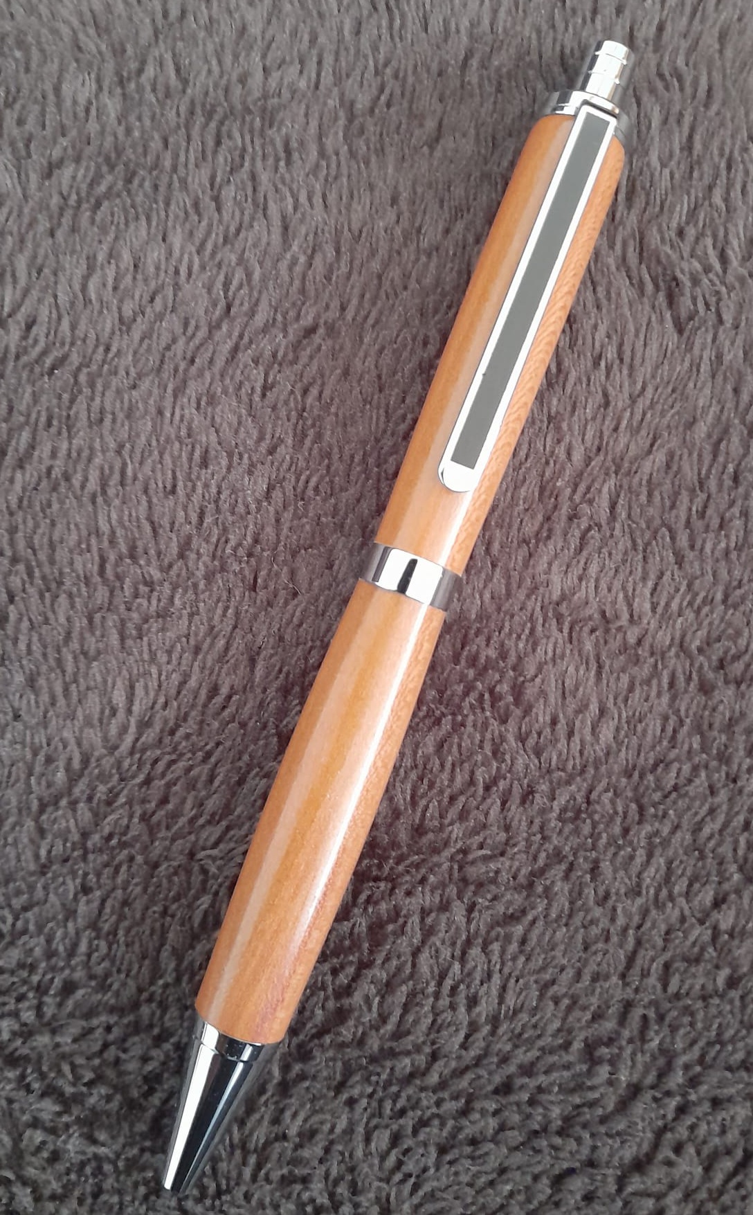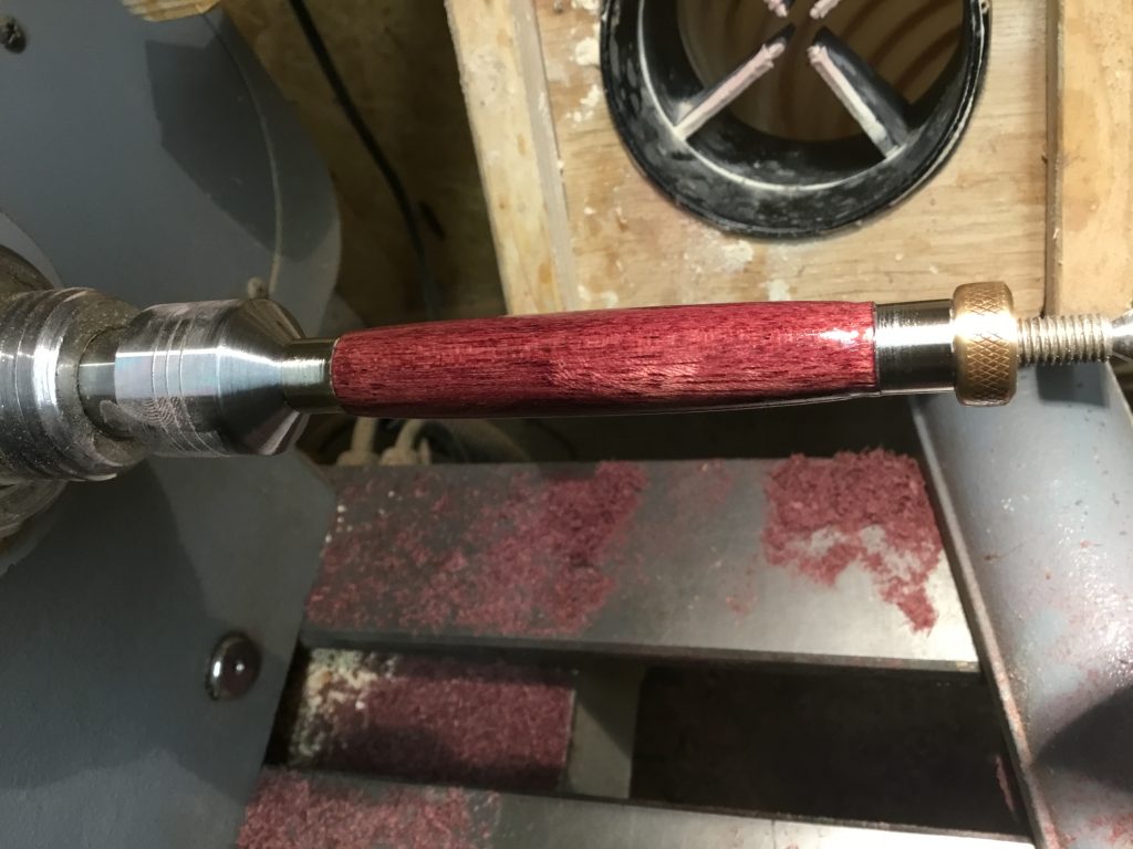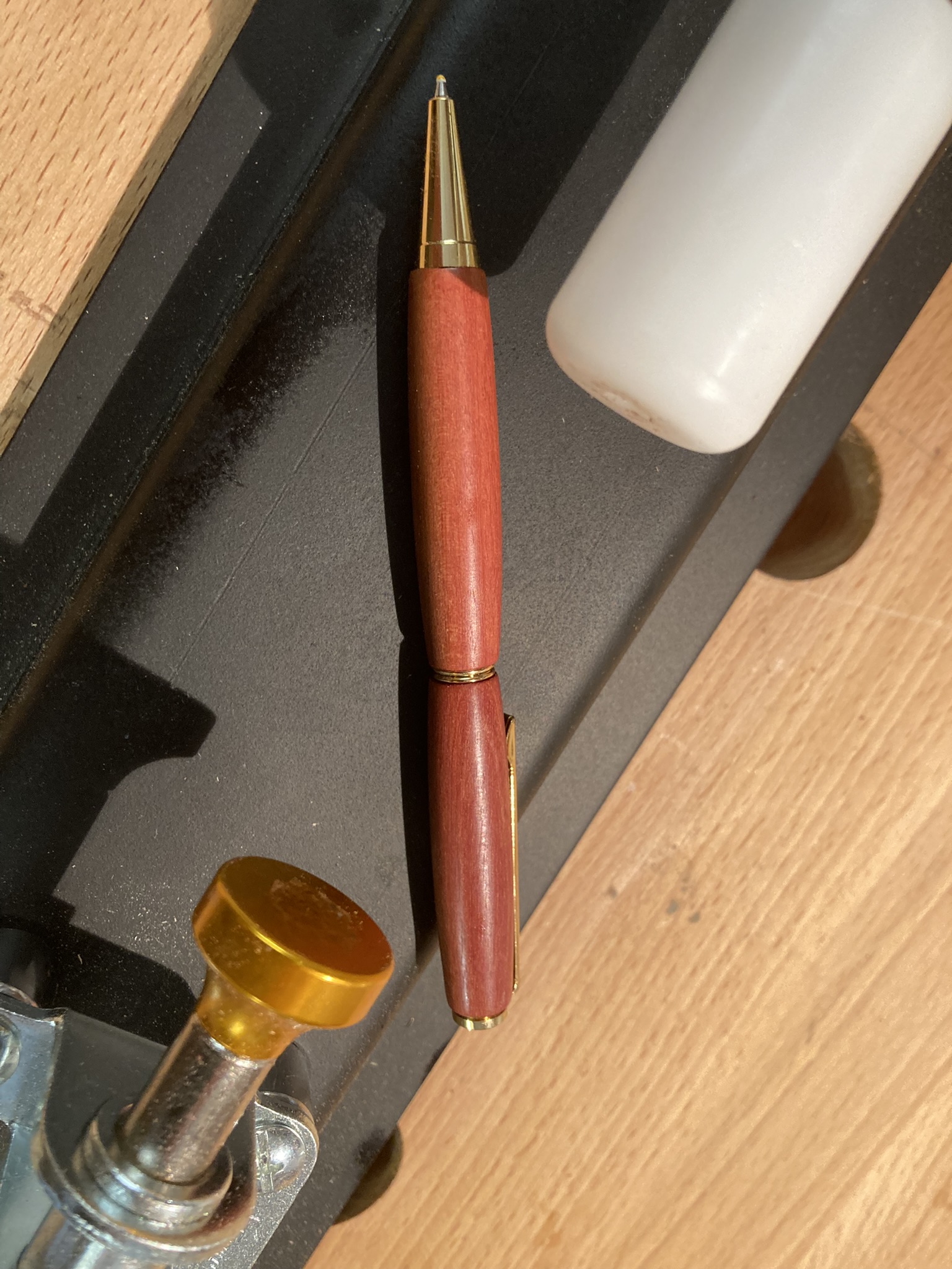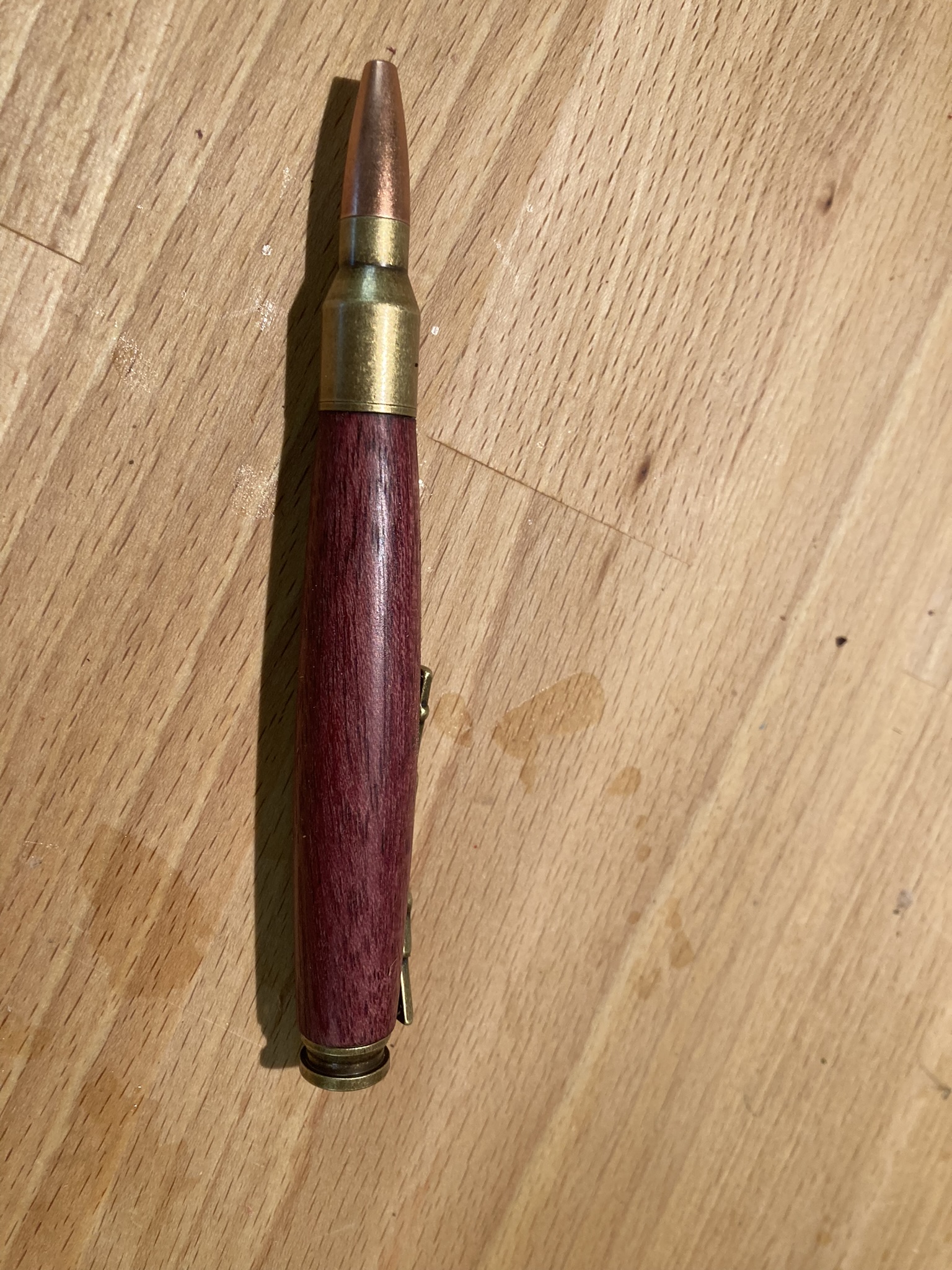 Der Kugelschreiber wurde aus Purpleheart (auch als Violettholz oder Amaranth bekannt) gedrechselt. Als Bausatz wurde das Modell Bullet verwendet. Die Oberfläche wurde bis Körnung 600 geschliffen. Danach wurde die Oberfläche mit Walnusswachs versiegelt und abschließend mit Walnussöl behandelt.