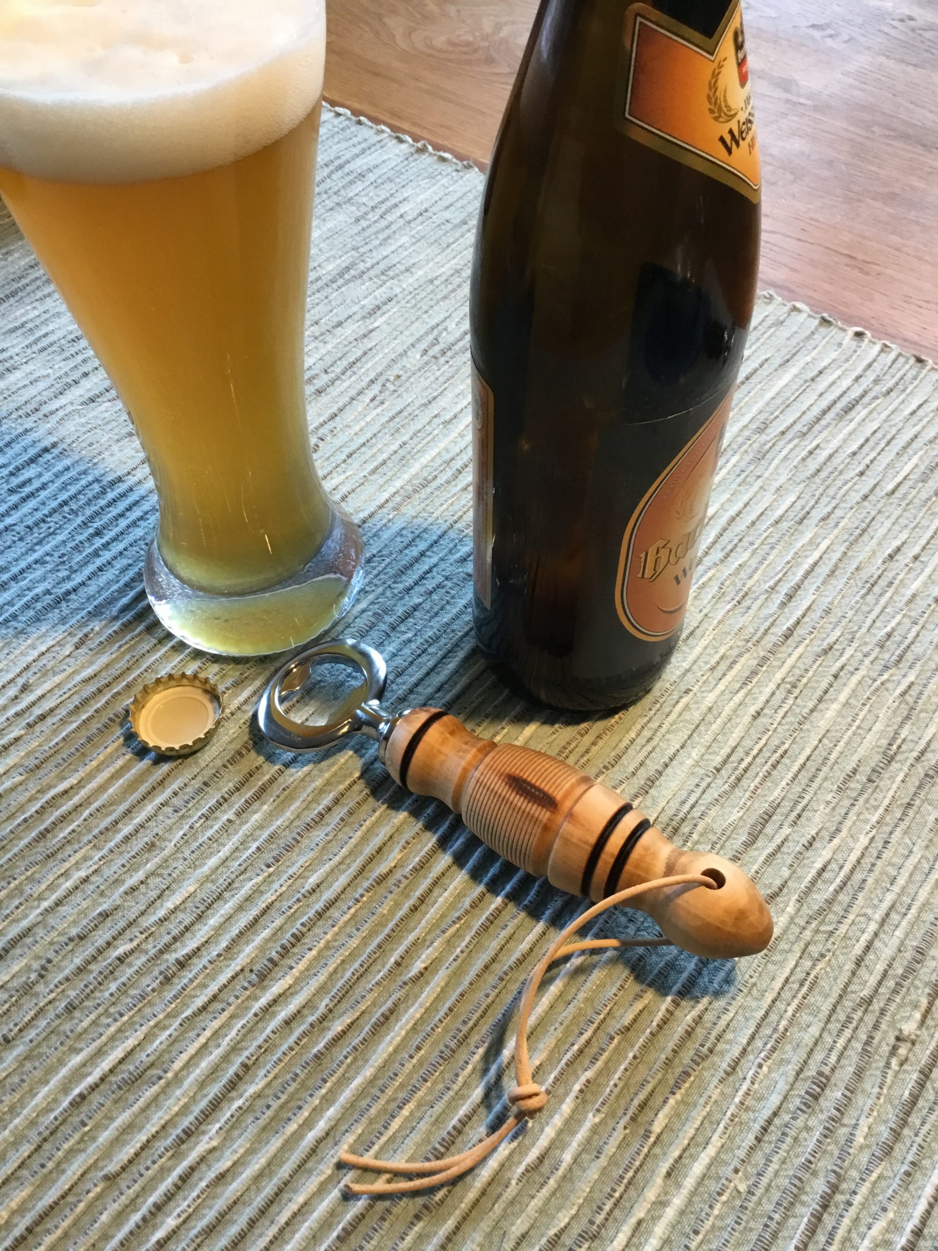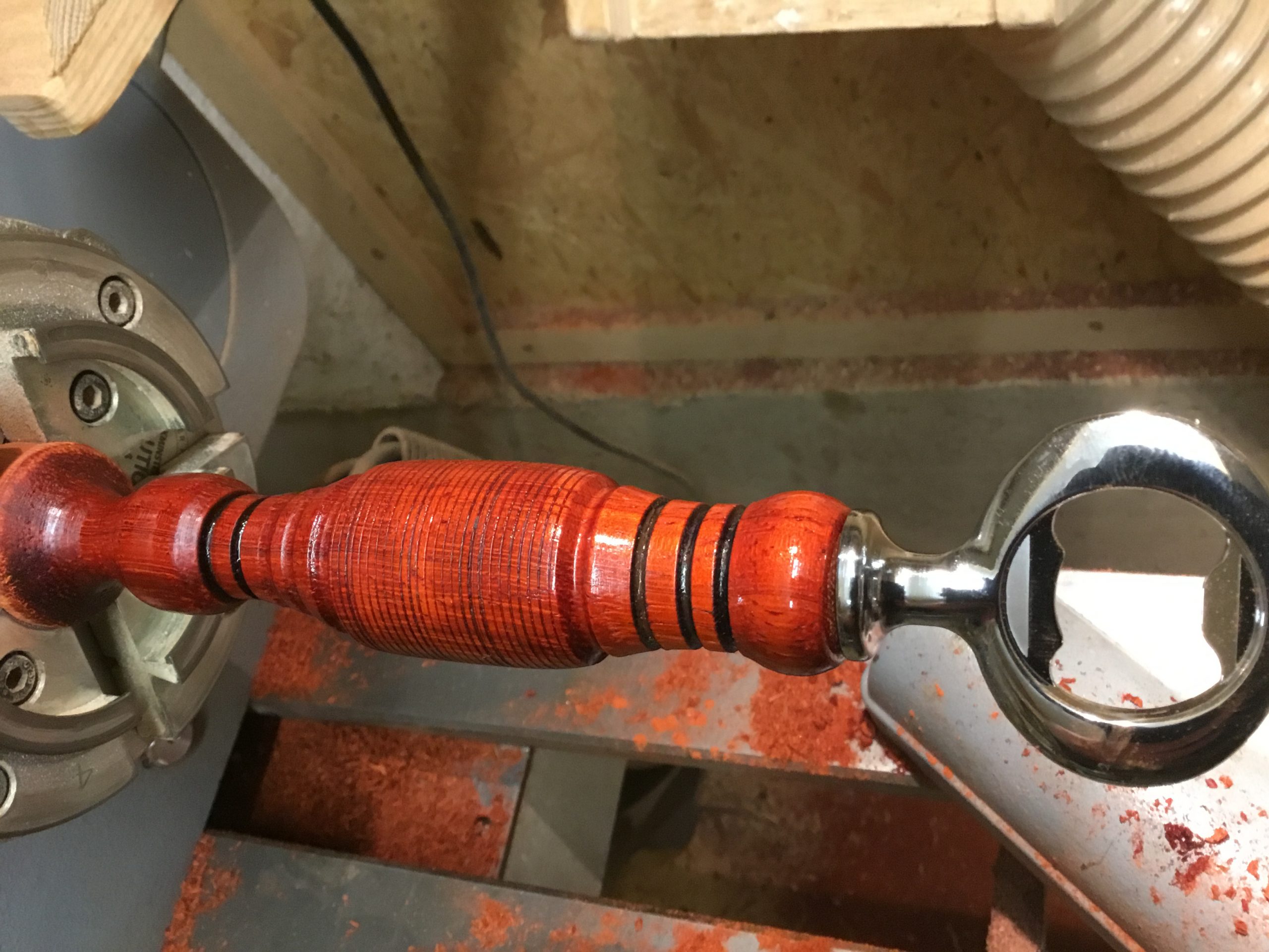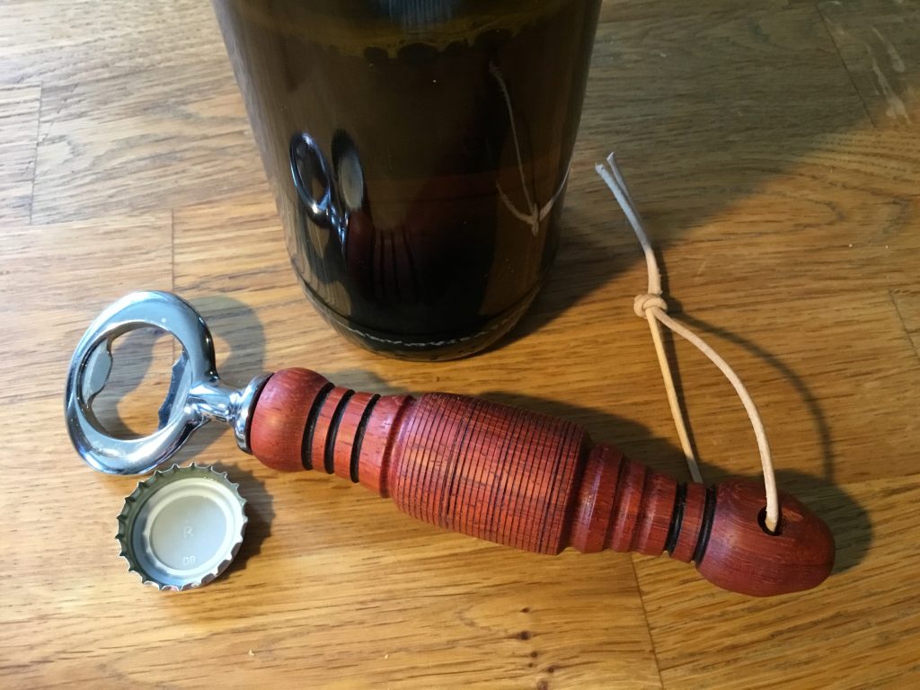 Der Flaschenöffner wurde aus African Rosewood (wächst in Westafrika,gehört zur Bubinga-Familie) gedrechselt. Den Bausatz gibts bei Dictum. Die Oberfläche wurde bis Körnung 400 geschliffen und mit Danish Oil behandelt.