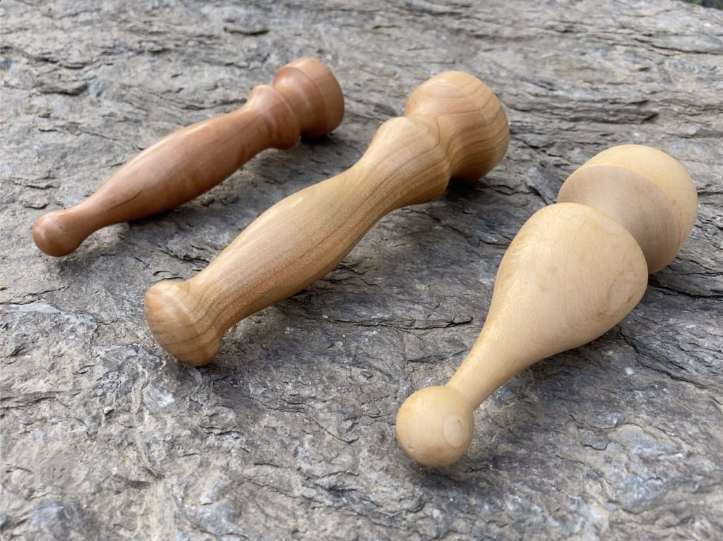3 Stäbe zur Anwendung bei Triggerpunkt- und Meridianmassage. Durchmesser zwischen 4,5 und 3 cm, Länge zwischen 12,5 und 14 cm. Aus Birnbaum, Kirsche und Bergahorn. Werkstätte für Nützliches und Feines * Christoff Guttermann