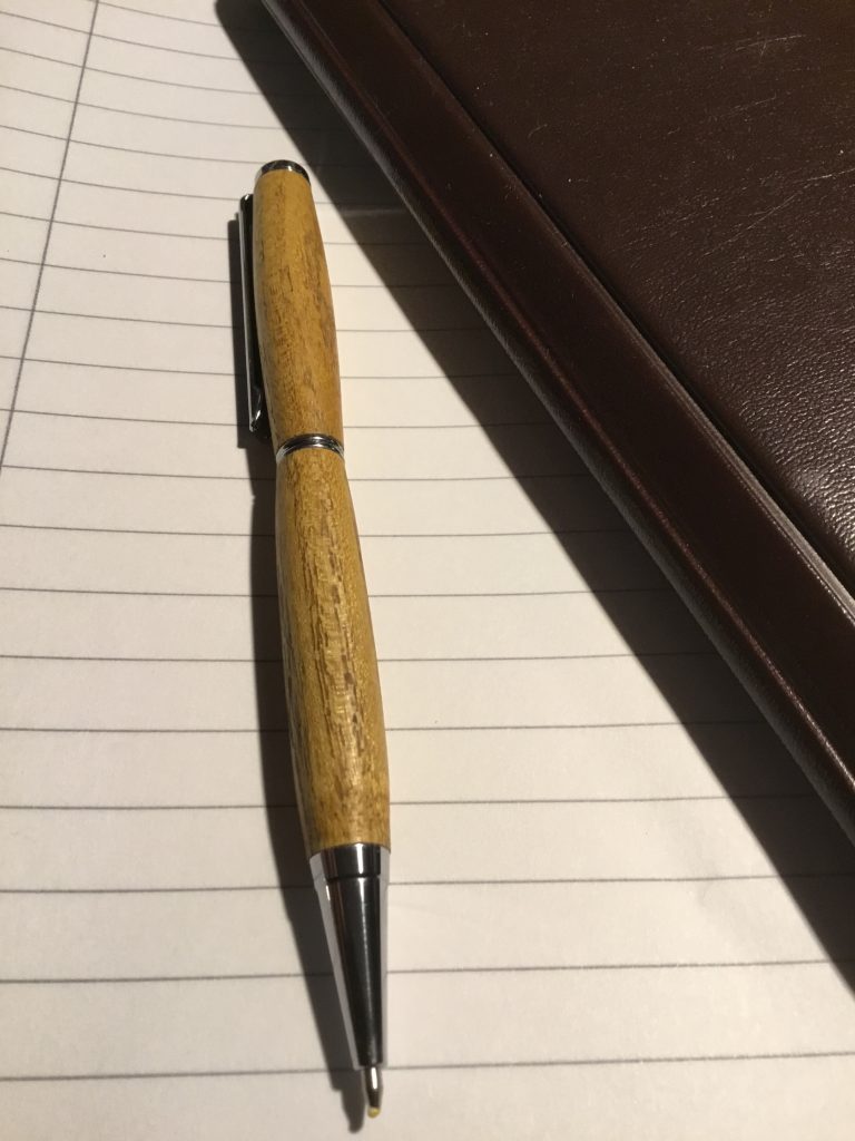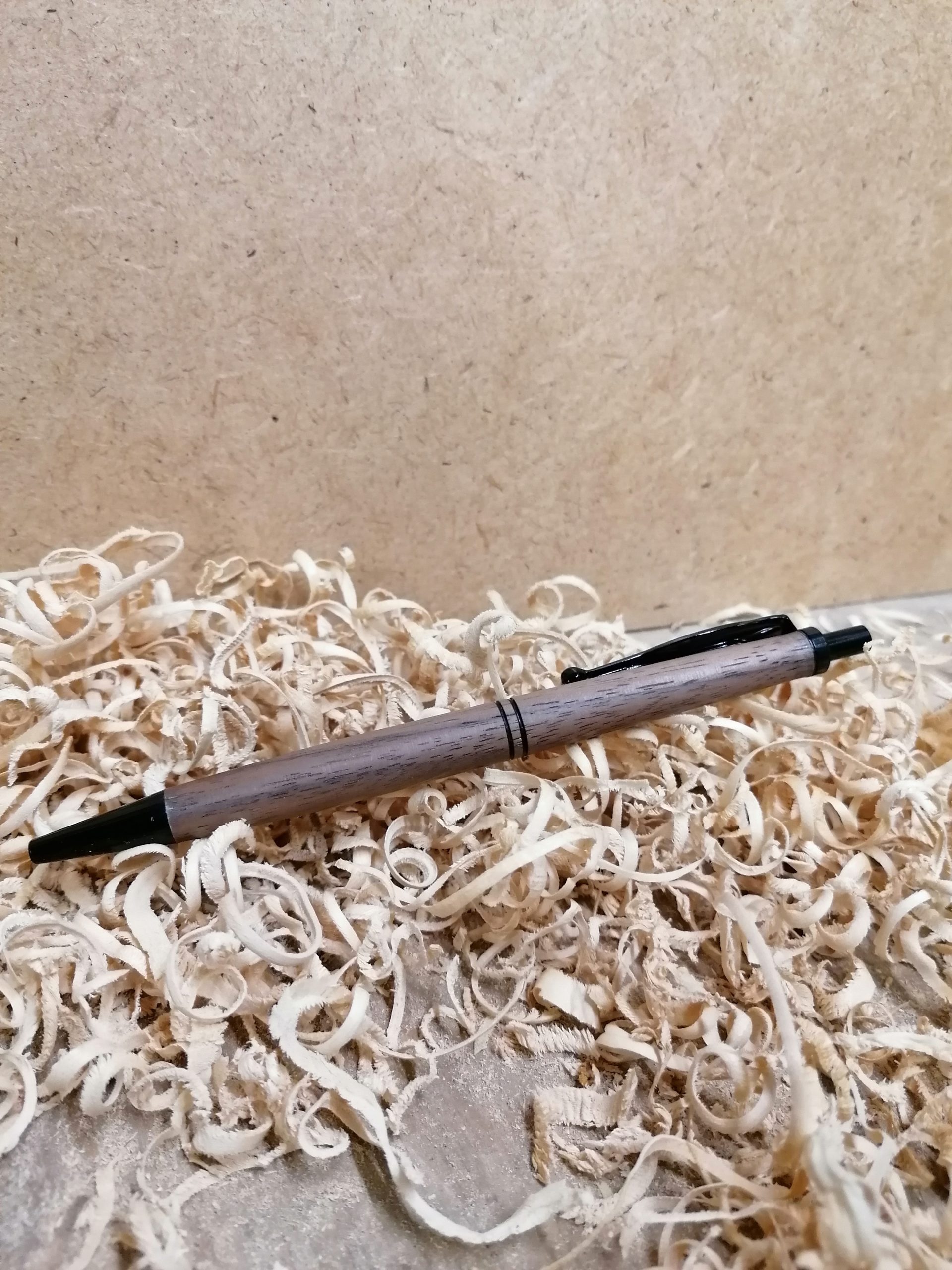 Klick Kugelschreiber aus amerikanischen Nussbaum. Die Oberfläche wurde mit einer Mischung aus Canauba – und Bienenwachs behandelt. Die Brandringe als Zierelement wurden mit dem Easy Wire Burning Kit von Dictum erstellt.