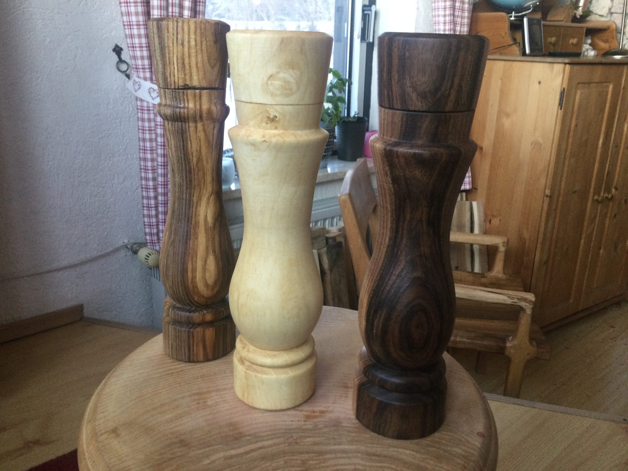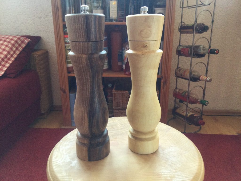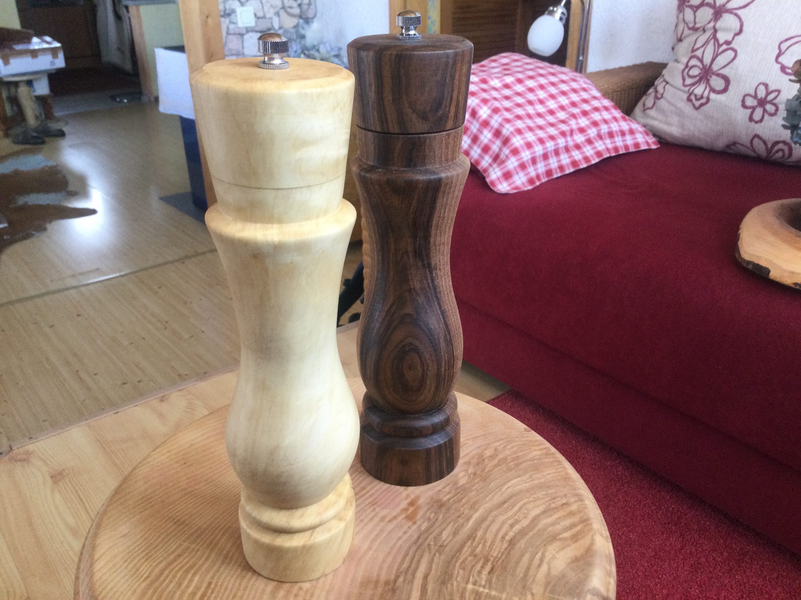 Die Mühlen sind aus Walnuss und Ahorn. Sie sind 23 cm hoch und mit Leinöl eingeölt worden.