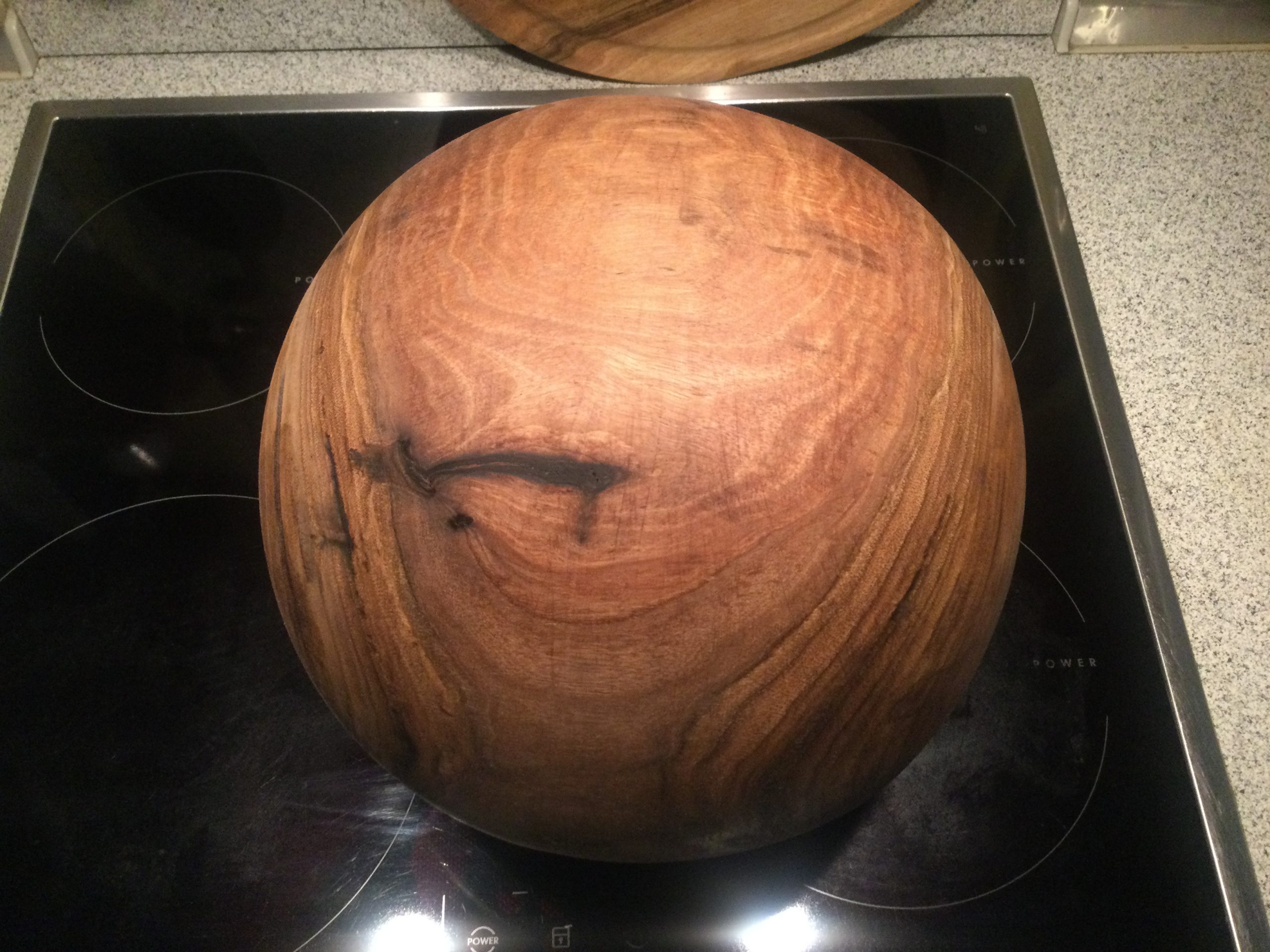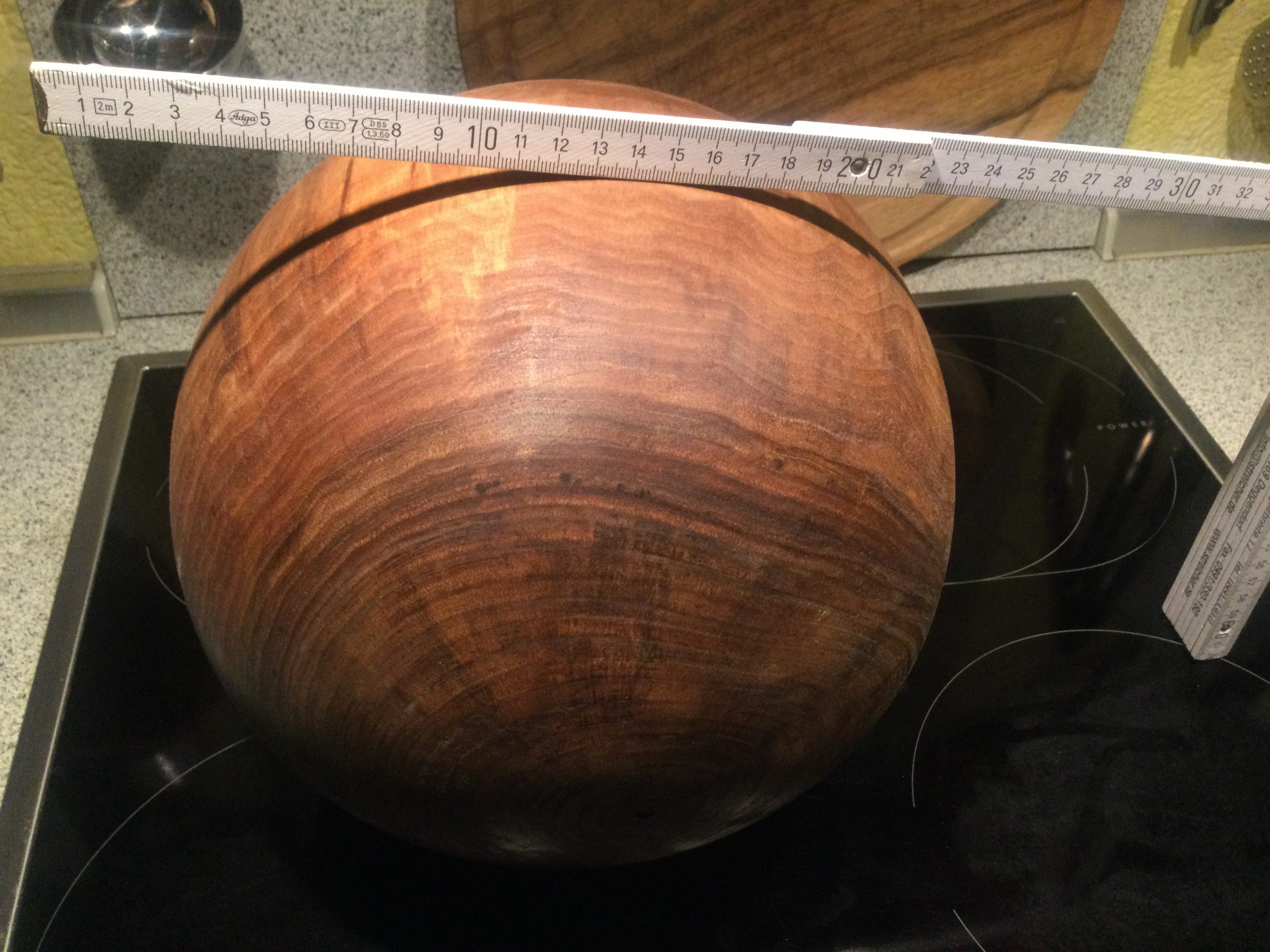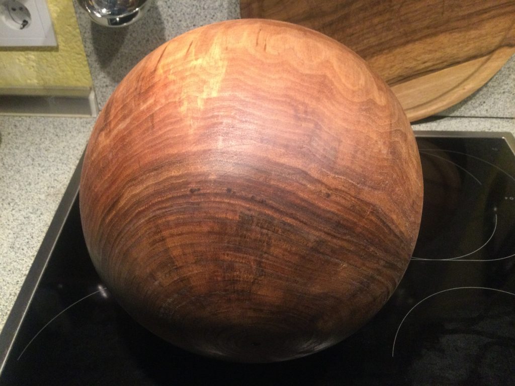 Die Kugel ist aus Walnussholz und hat einen Durchmesser von 25 cm. Sie wurde mit Leinöl eingeölt.