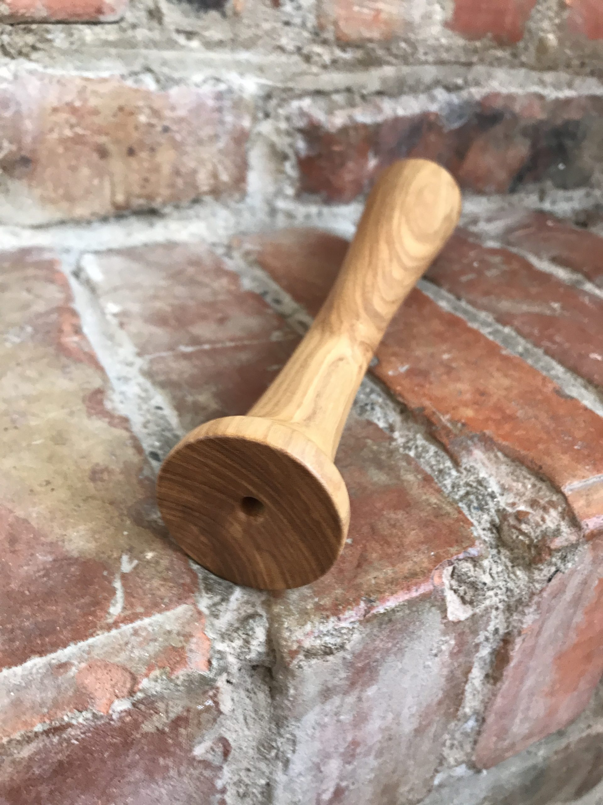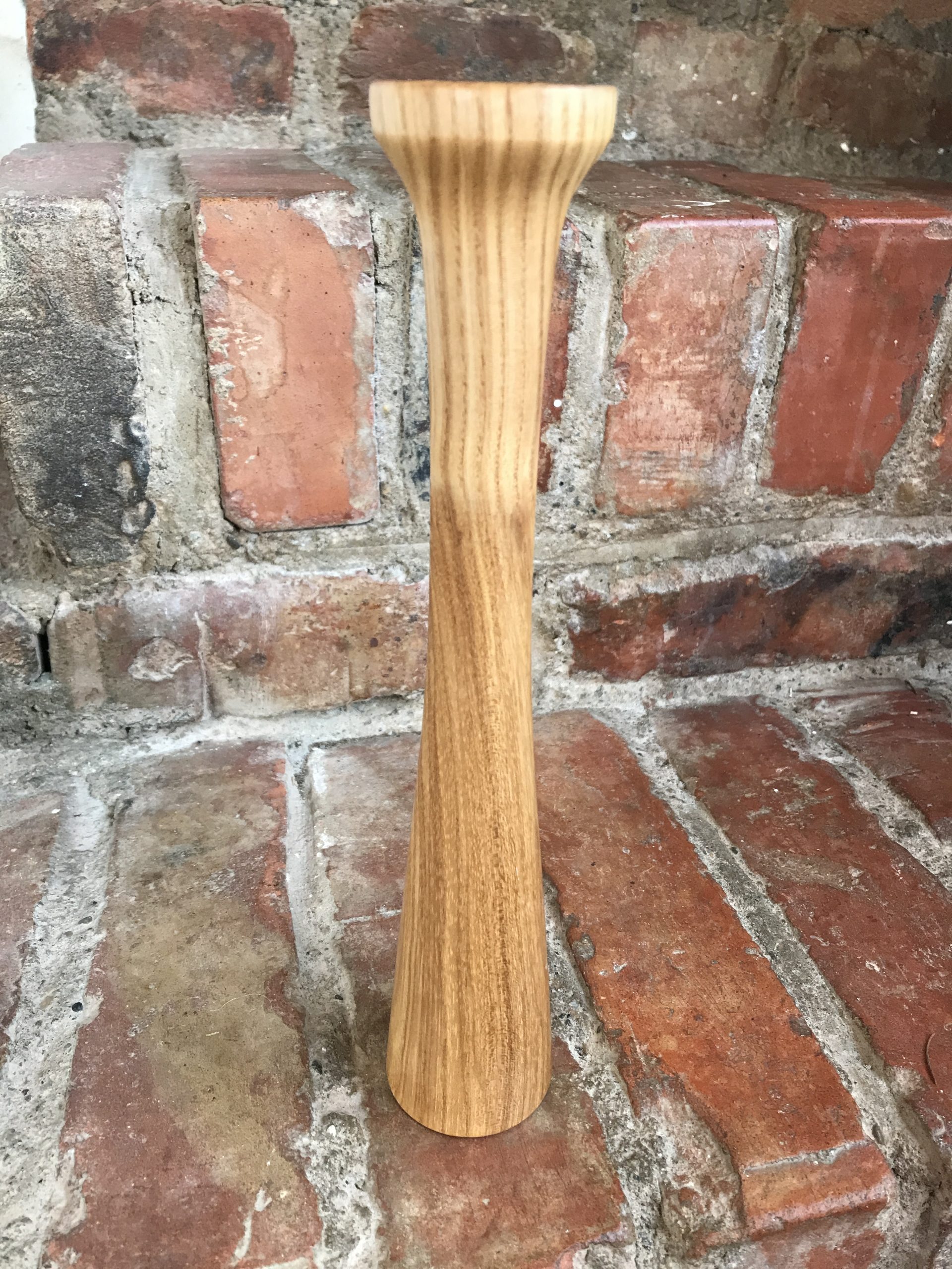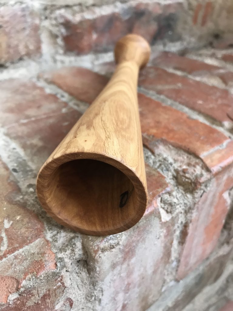 Pinard-Rohr aus schön gefärbter Esche. Zum Lauschen am Babybauch. Ca. 250mm lang. Zum Aushöhlen habe ich ein altes Eisen zurechtgeschliffen. Oberflächenbehandlung mit Tungöl.
