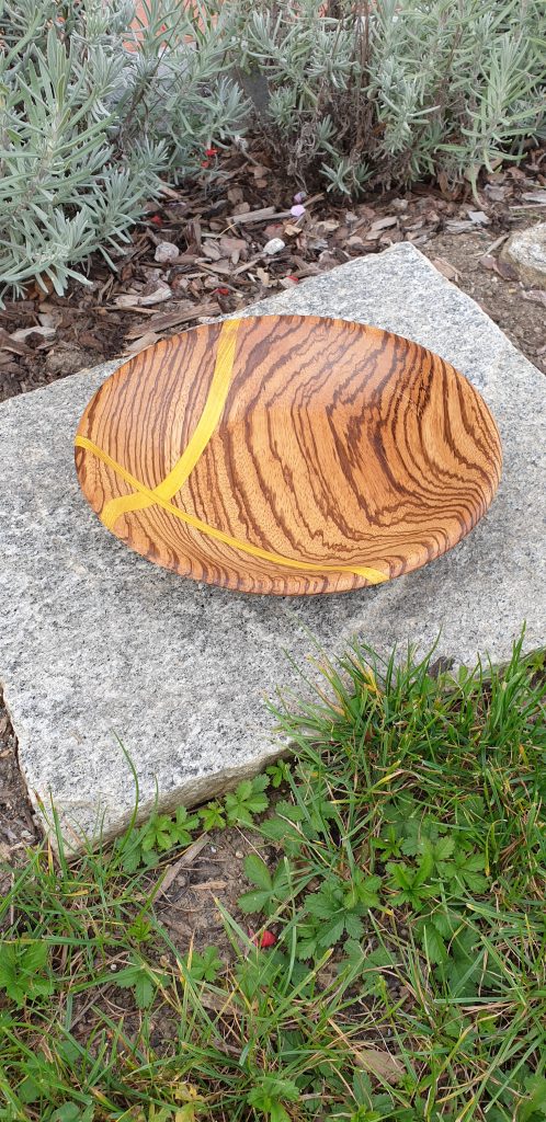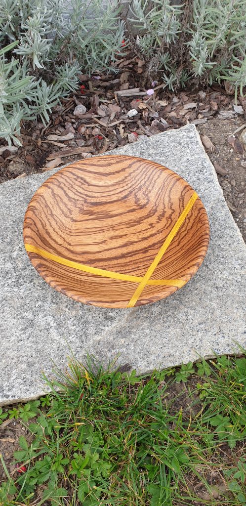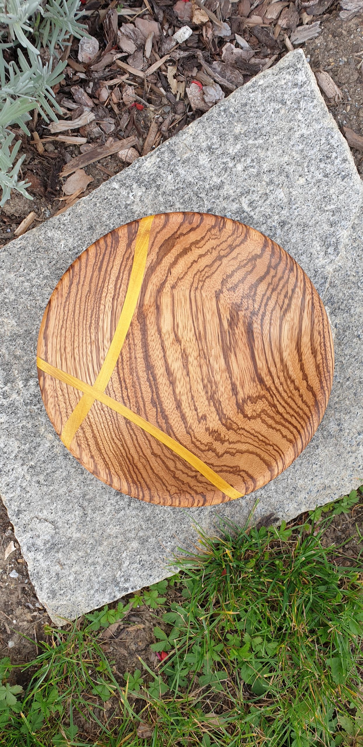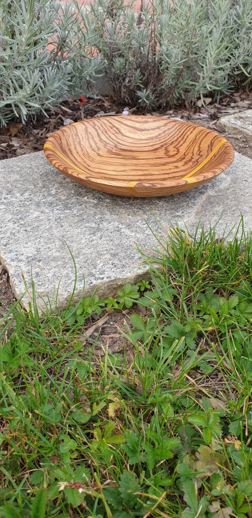 Schale gedrechselt aus Zebrano, mit Osage Orange verleimt. Zum Schluss mit Danish Oil behandelt.