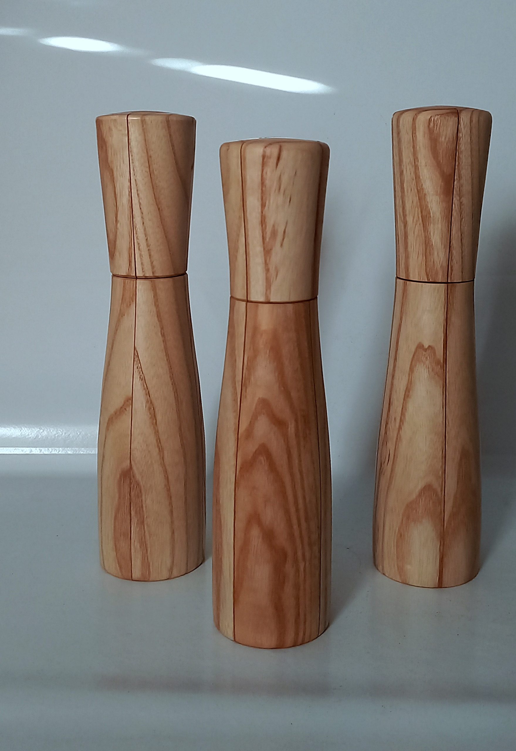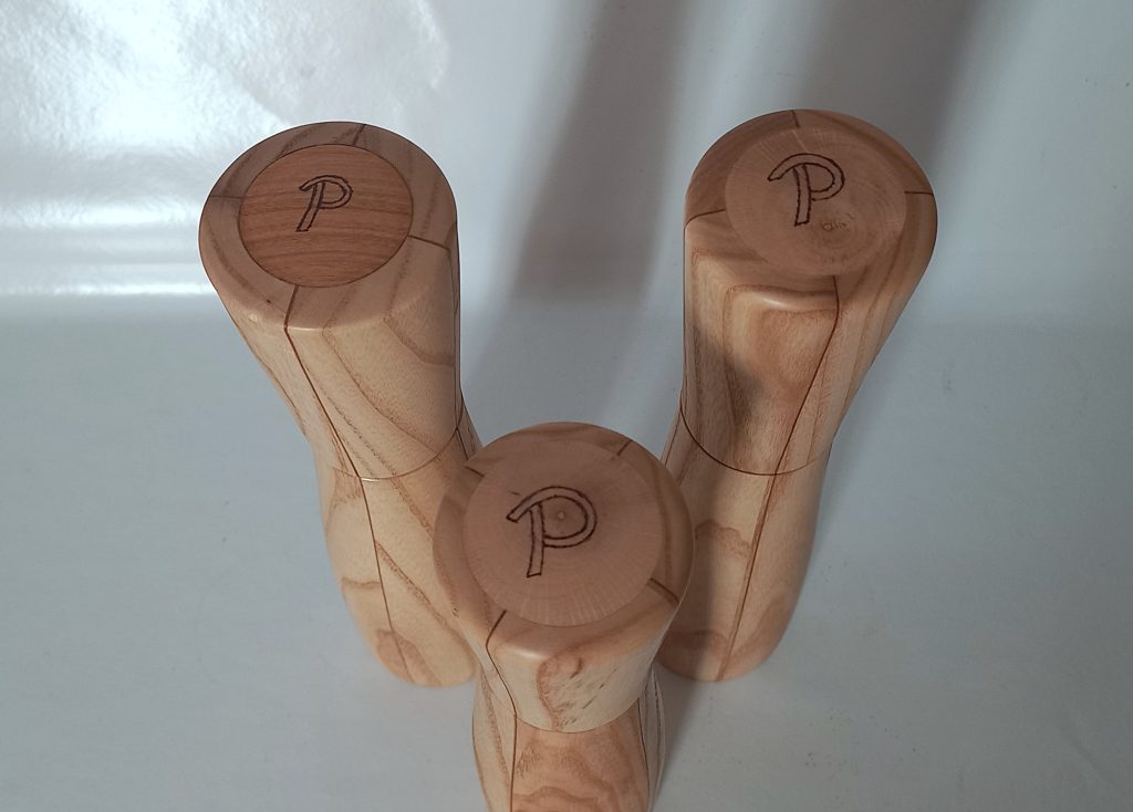 Pfeffermühlen aus Esche mit Kreuzadern aus Birnbaumfurnier im Oberteil ein Medaillon mit einem „P“ für Pfeffer. Oberfläche 1x mit Tungöl von DICTUM eingelassen.