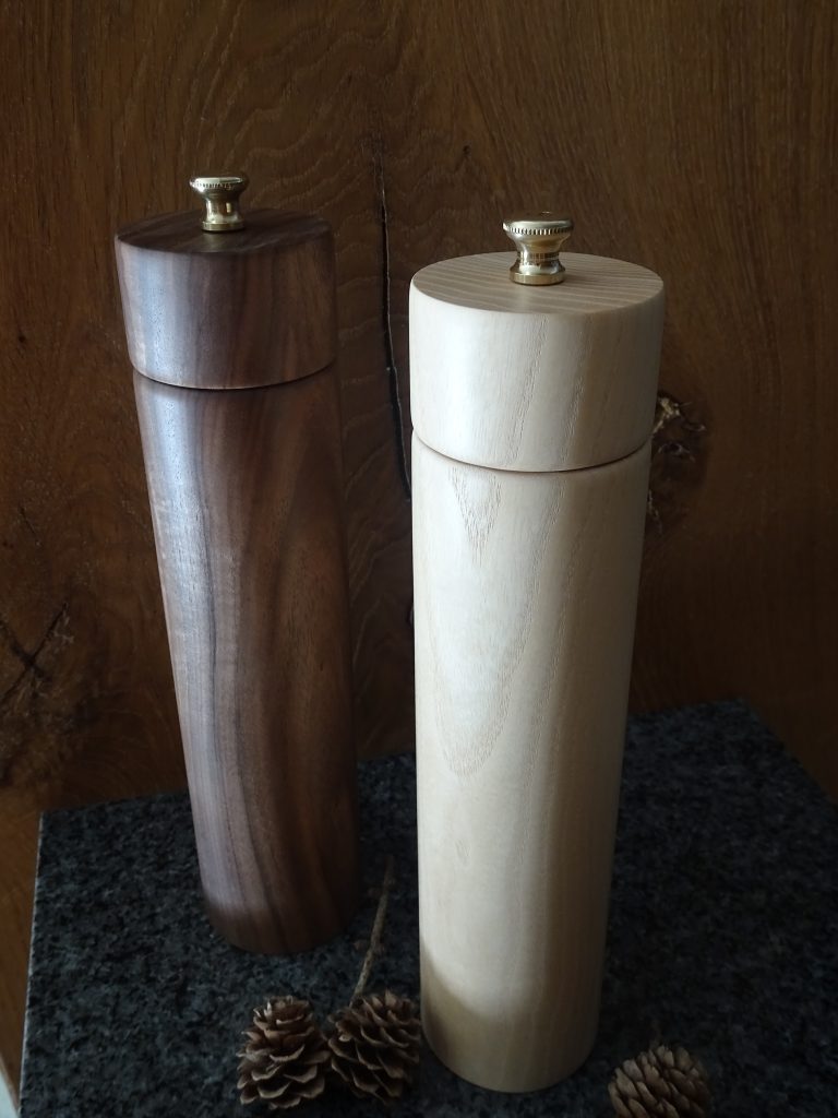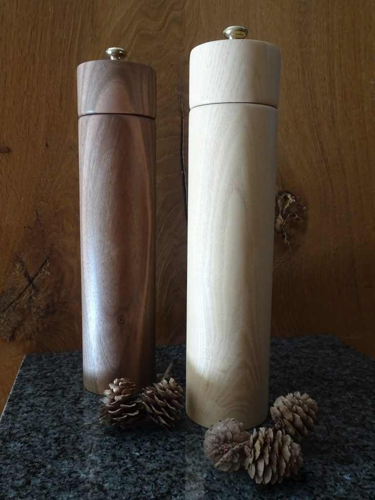 Pfeffer- und Salzmühle aus Esche und Nussbaum. Diesmal in komplett gerader Form. Verwendet habe ich die Lidrewa-Keramikmahlwerke aus dem DICTUM-Sortiment, aus dem auch die Holzstücke stammen. Das „S“ auf dem Deckel des Mahlwerks lässt sich gut herausschleifen. Beide Mühlen wurden geschliffen bis Körnung 400 und danach geölt, wobei die Esche-Mühle mit weißem Drechsleröl behandelt wurde, um ein Nachdunkeln des Holzes zu vermeiden.