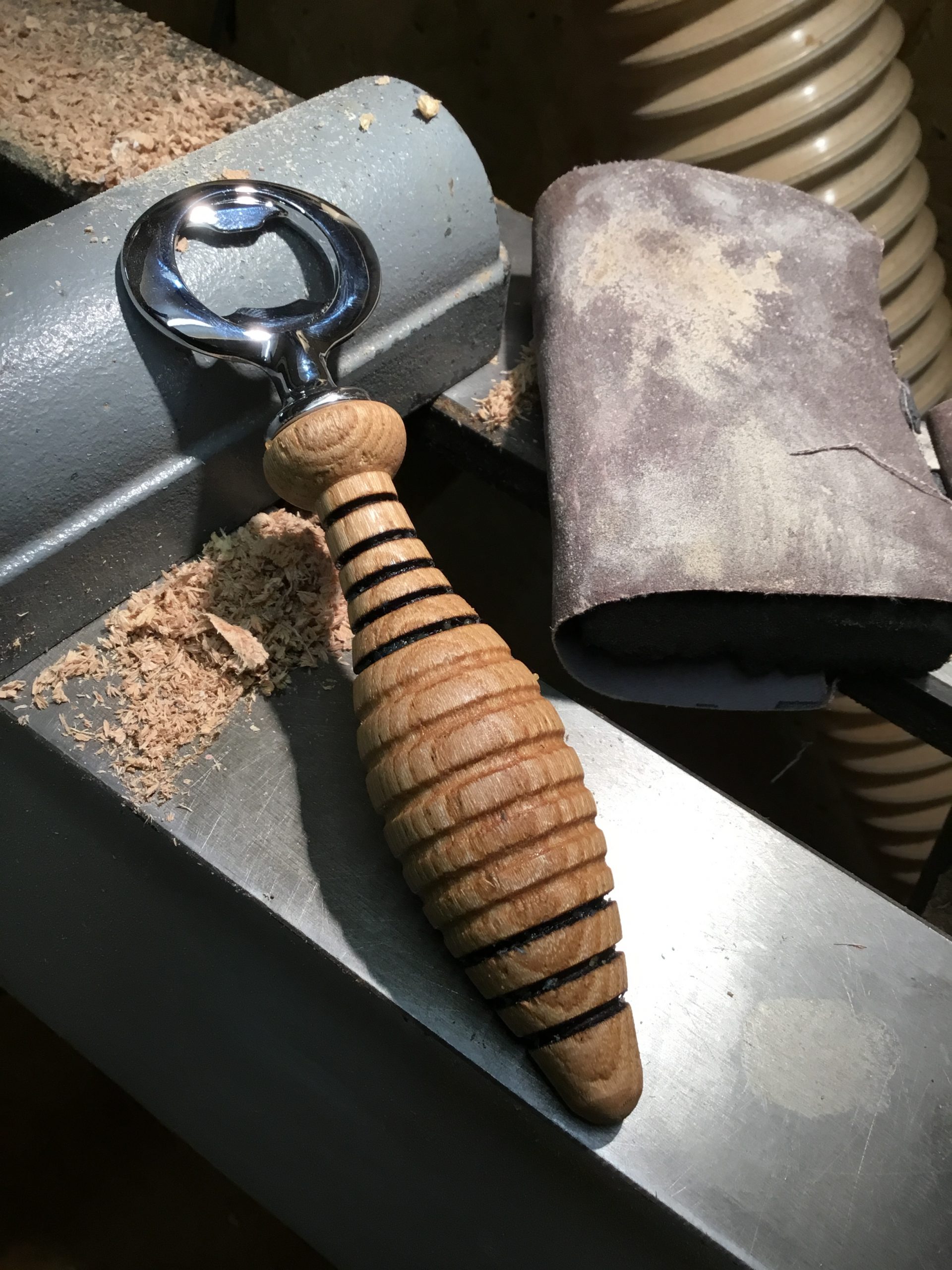 Der Flaschenöffner wurde aus dem Holz einer Ulme gedrechselt. Den Bausatz gibt es bei DICTUM!