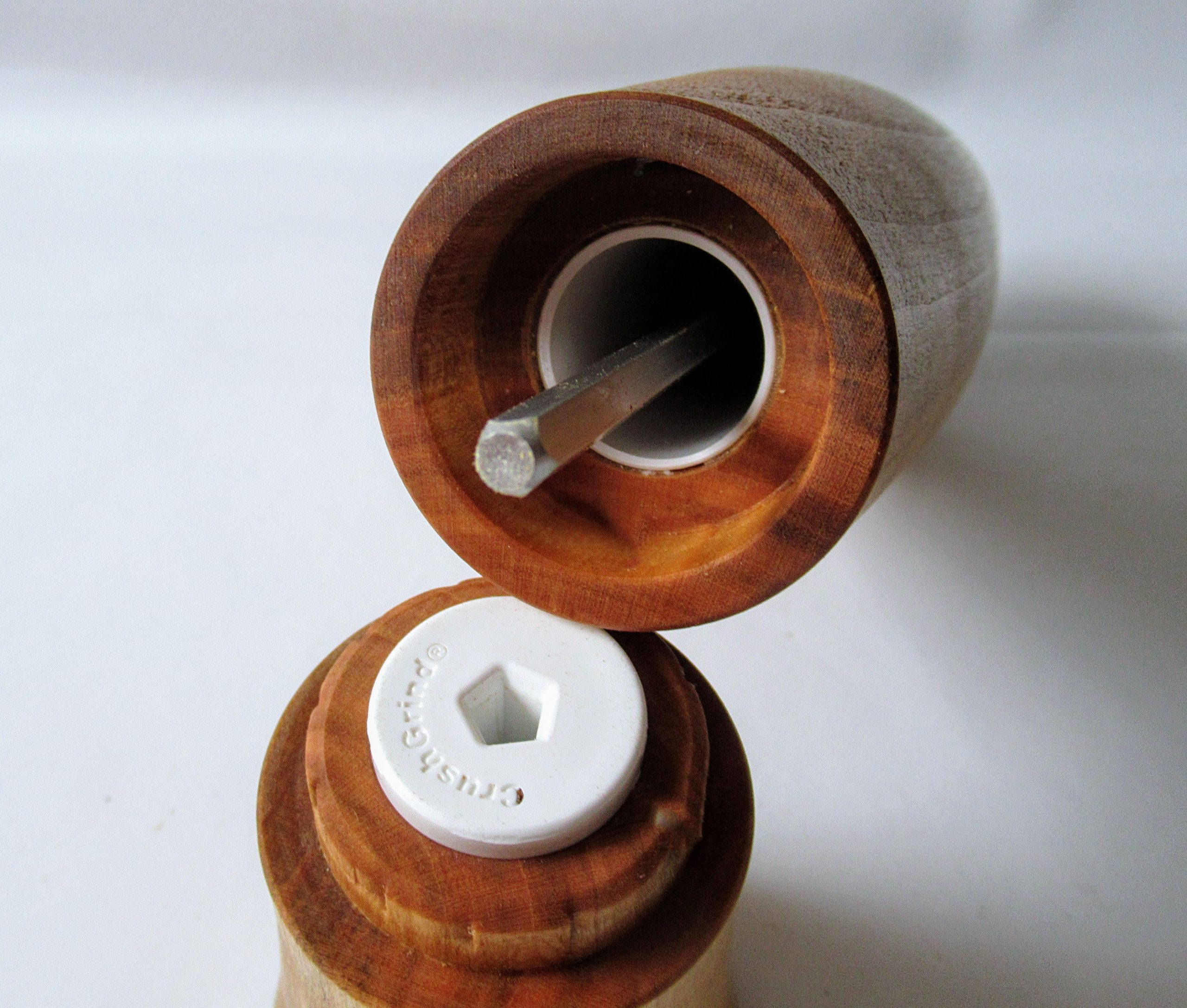 Pfeffermühle aus Kirschbaum mit Medaillon im Oberteil.