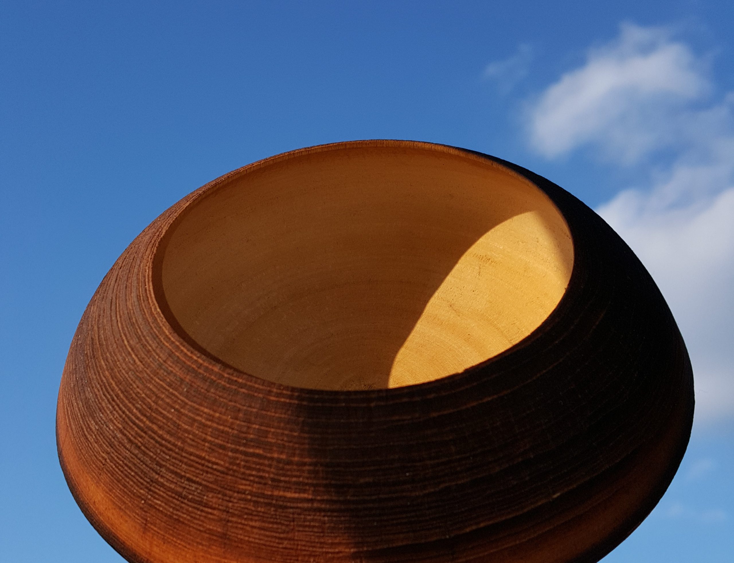 Sie misst 22 cm im Durchmesser und ist 5 cm hoch. Geschliffen wurde bis Körnung 320, Oberflächenbehandlung mit Danish Oil.
