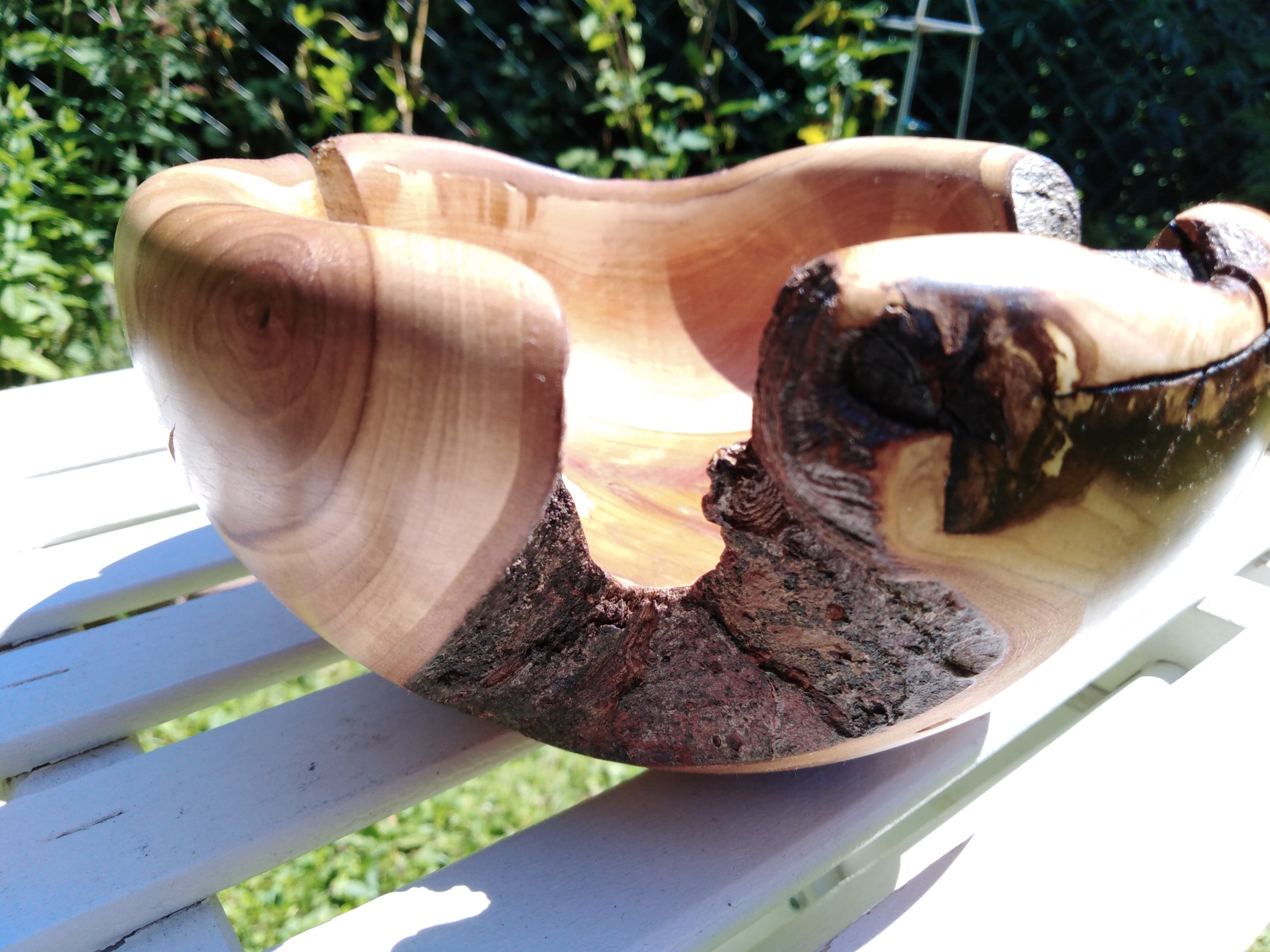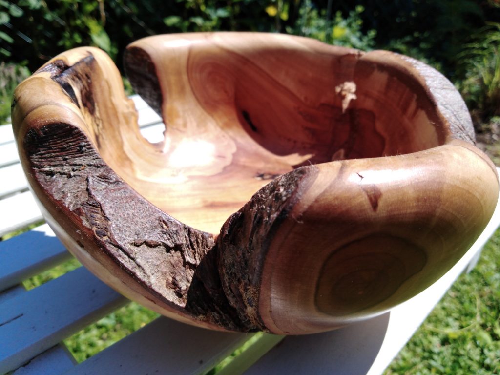 Aus einem sehr verwachsenen Stück Apfel von einem Baum meines Großvaters habe ich eine teilweise „Live-Edge“-Schale gedrechselt. Leider musste ich aufgrund der Spitzenhöhe meiner kleiner Drechselbank recht viel des Stückes wegsägen. Die Schale war bis zum Ende sehr unwuchtig, die Unterbrechungen machten das Schleifen etwas spannend. Das Finish ist wieder Hartwachsöl.