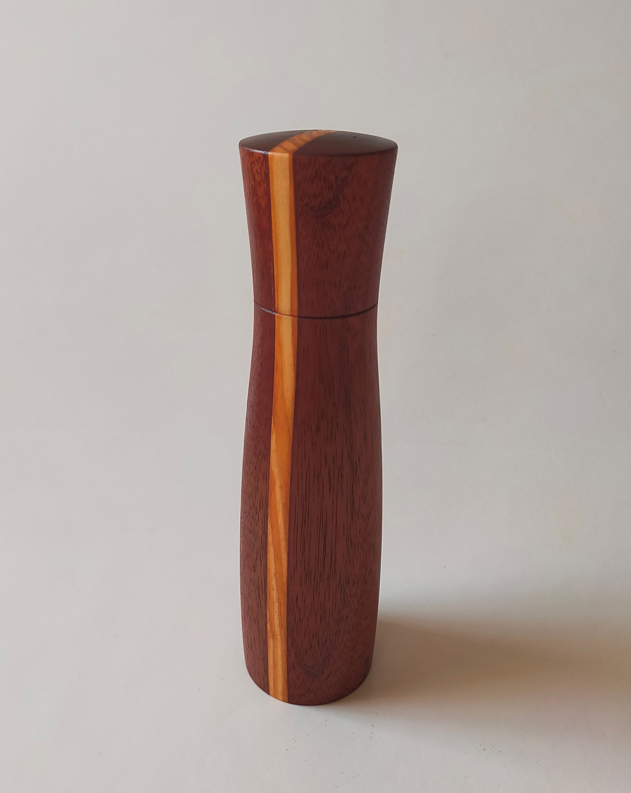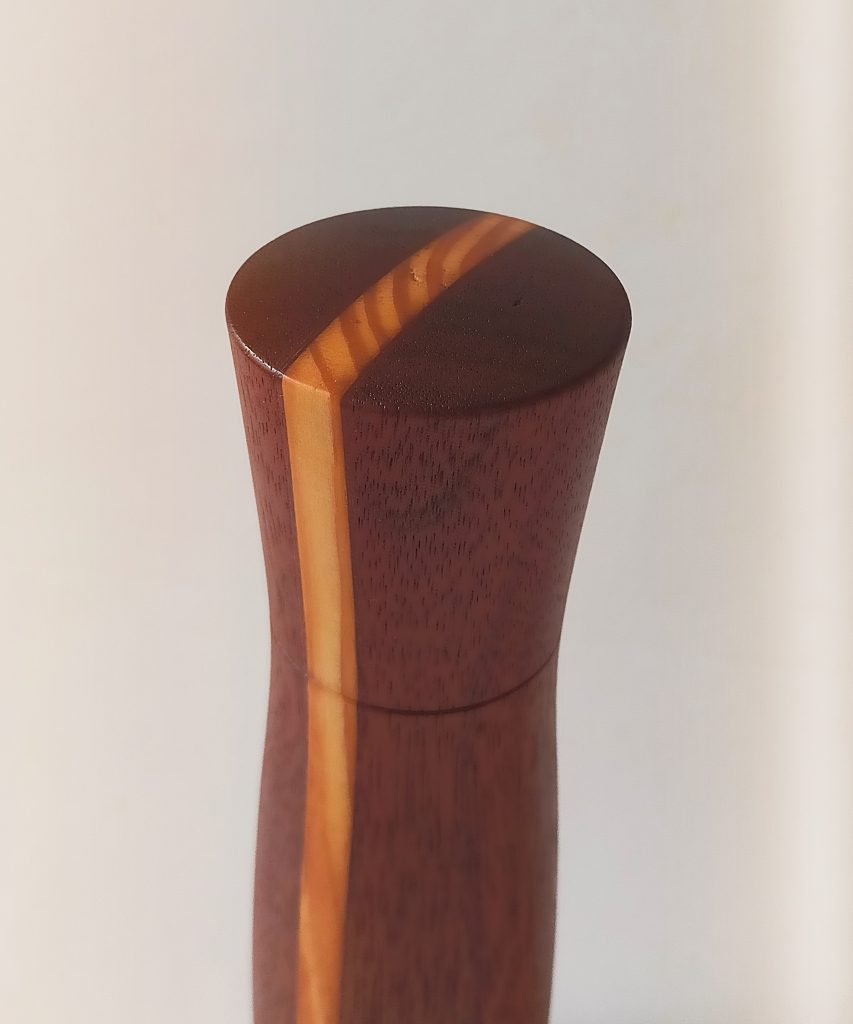 Pfeffermühle aus Robinie + Korkenzieherhasel. Um das Mahlgut neutral zu halten, habe ich ein 25mm Acrylrohr eingepresst. Oberfläche 2x mit Tungöl von DICTUM eingelassen.