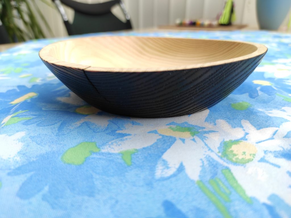 Diese kleine Schlüsselschale habe ich aus einem Stück Esche gedrechselt und anschließend die Außenseite mit der jap. Shou Sugi Ban Technik behandelt. Leider war das Holz noch etwas feucht und hat sich dabei etwas verzogen und einen Riss entwickelt. Der Boden wurde deshalb noch einmal überdrechselt, damit sie Schale trotzdem Plan steht.