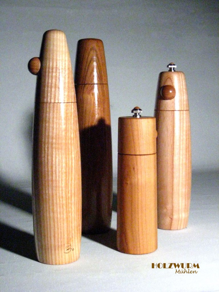Mühlen mit „Morel“ und „CrushGrind“-Mahlwerken, Hölzer: Robinie, Eberesche/Speierling, Kirschbaum, Oberflächen: Danish Oil