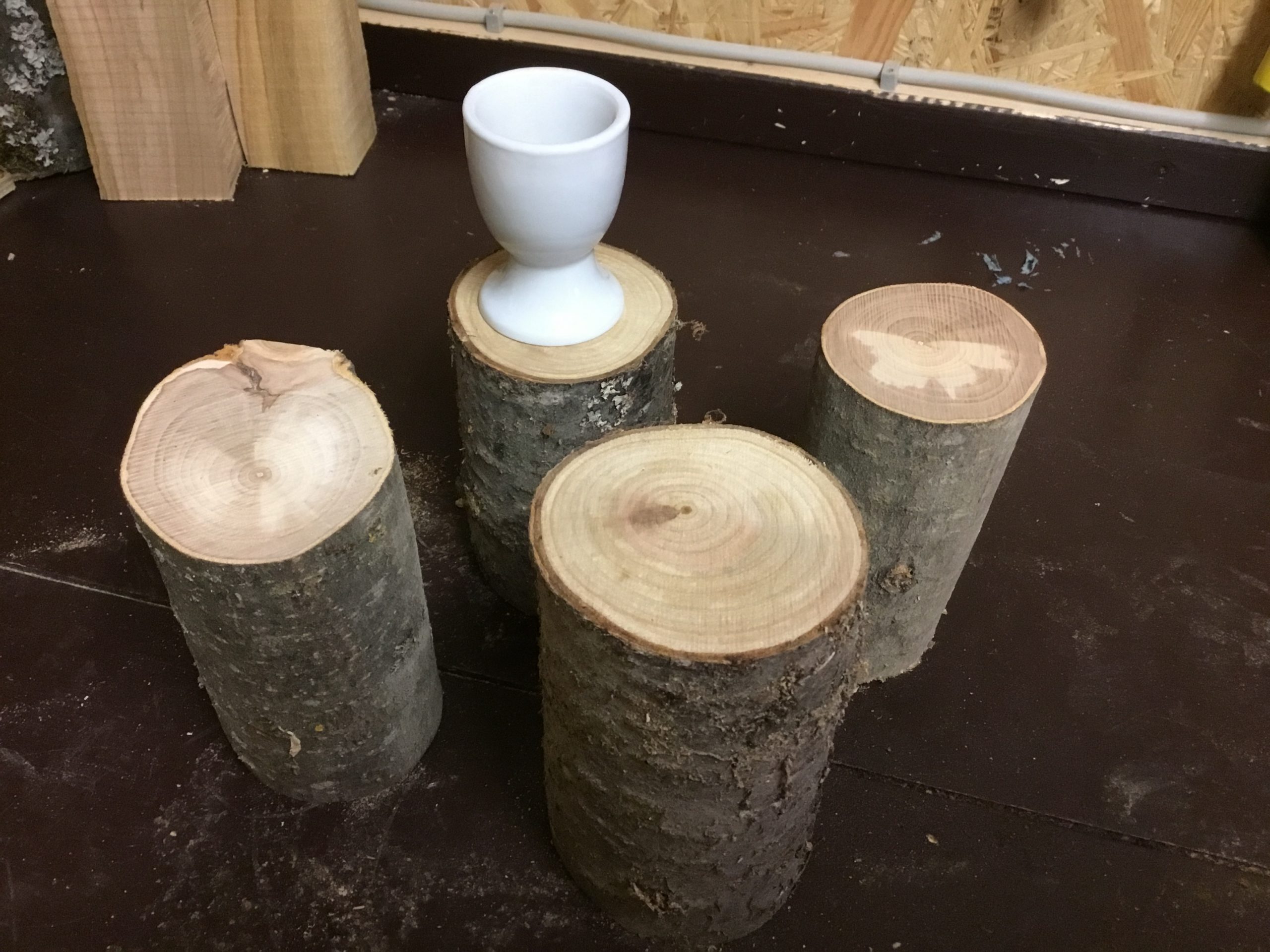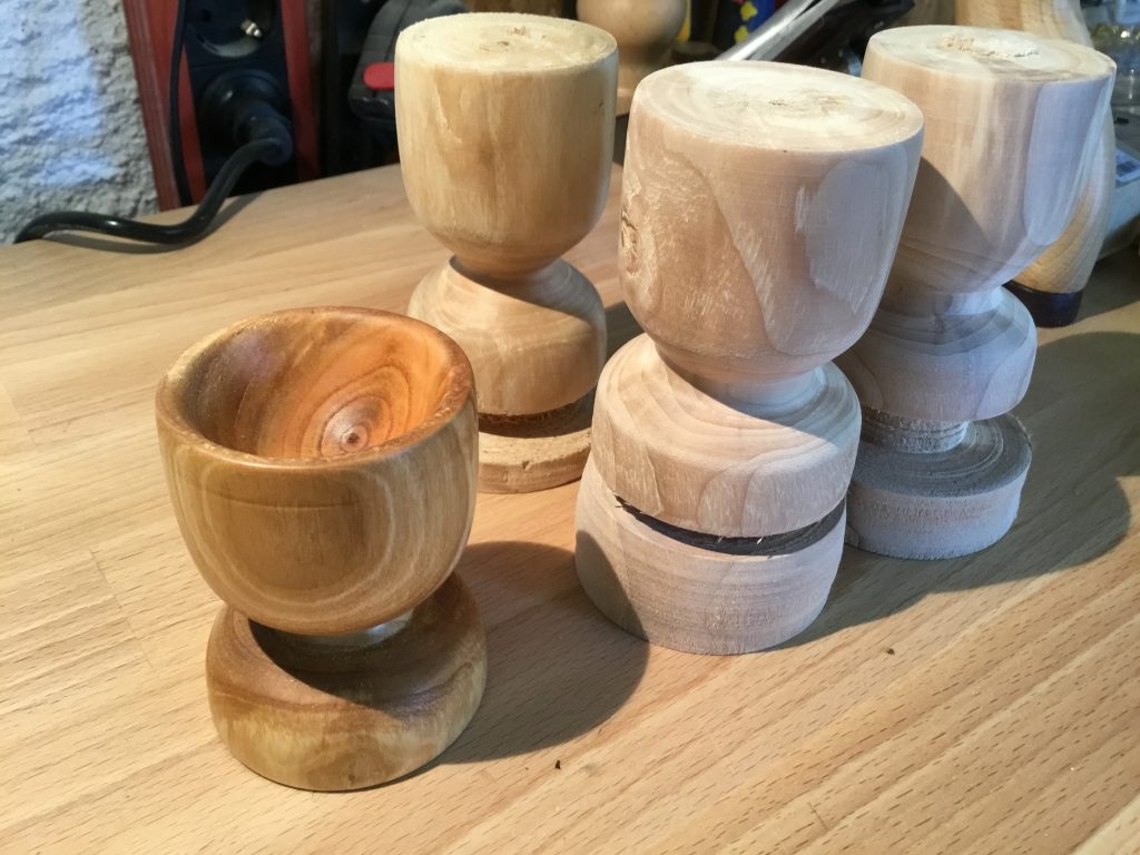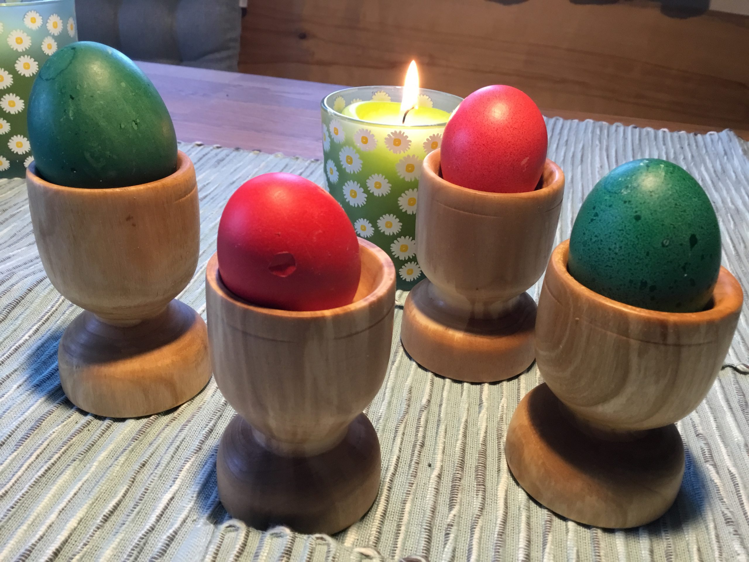 Die Eierbecher wurden aus dem Ast eines Birnenbaumes gedrechselt. Höhe 7,5 cm, Durchmesser 5 cm. Die Oberfläche wurde bis Körnung 400 geschliffen und danach mit Danish Oil von DICTUM behandelt.