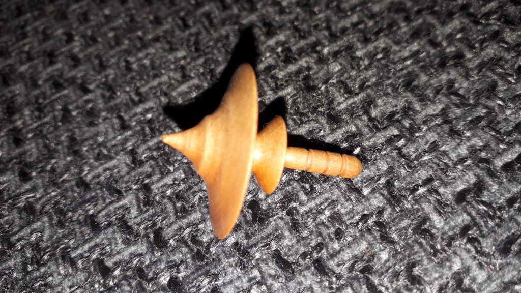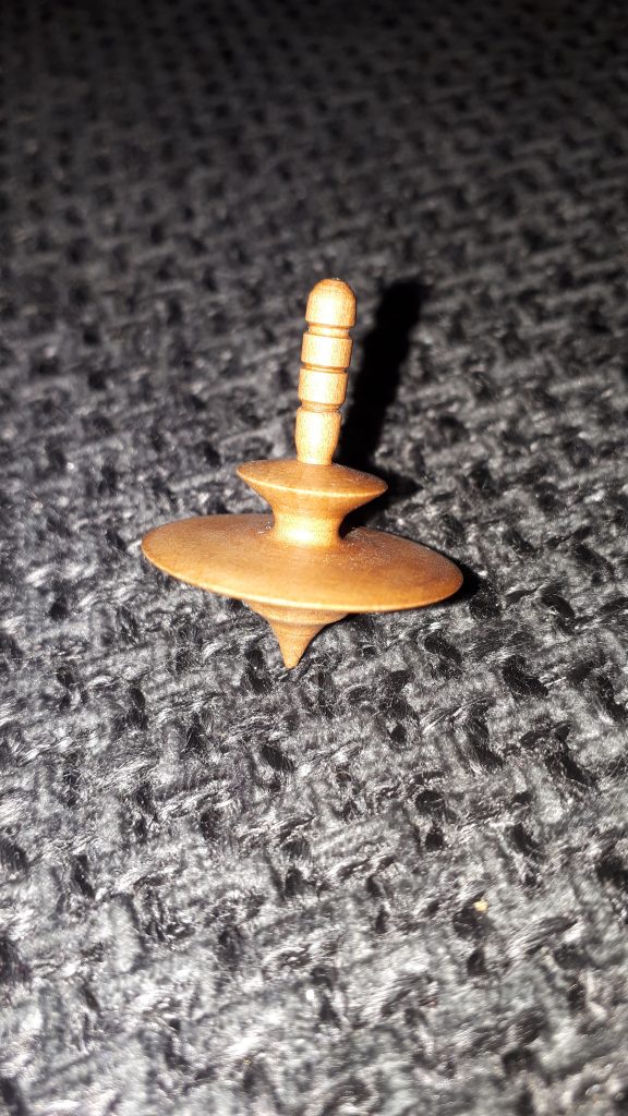 Kleiner Kreisel aus Apfelholz gedrechselt. Der Kreisel hat eine Höhe von 3 cm und einen Durchmesser von 2,5 cm Endbehandlung mit Carnauba Wachs.
