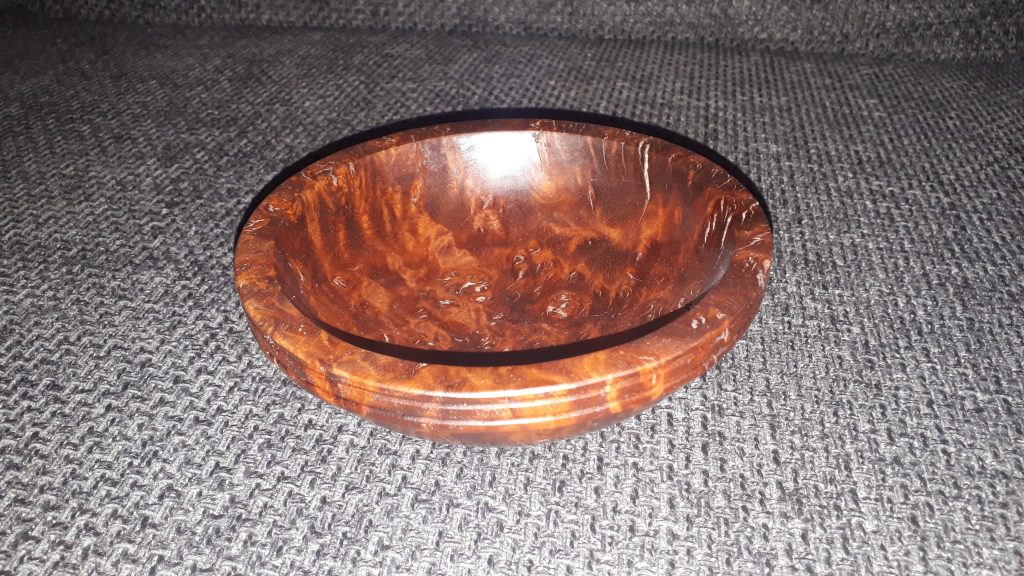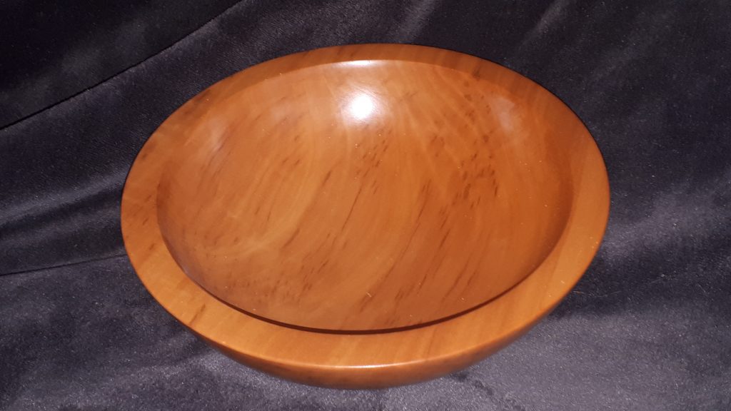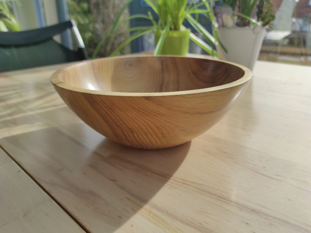 Obstschale aus gedämpftem Birnbaum gedrechselt. Oberflächenbehandlung mit Danish Oil. Durchmesser 23cm, Höhe 6,5cm.