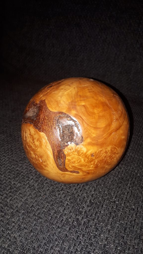 Gedrechselte Holzkugel aus dem Wurzelstock eines Apfelbaums mit Rindeneinschlüssen.